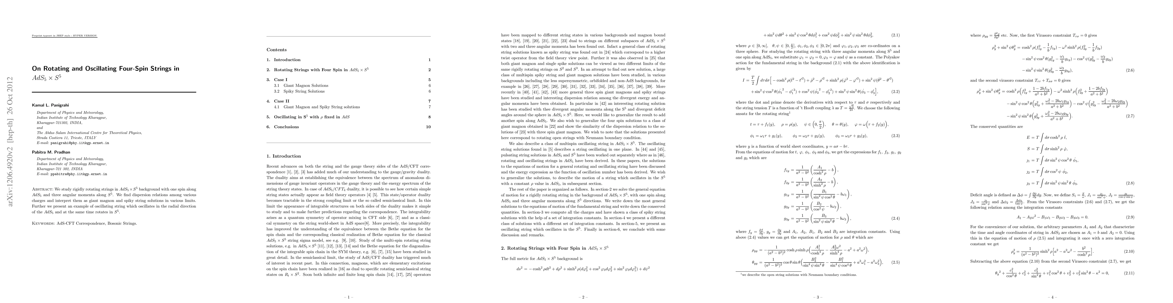 We study rigidly rotating strings in AdS5 X S5 background with one spin along AdS5 and three angular momenta along S5. We find dispersion relations among various charges and interpret them as giant magnon and spiky string solutions in various limits. Further we present an example of oscillating string which oscillates in the radial direction of the AdS5 and at the same time rotates in S5.