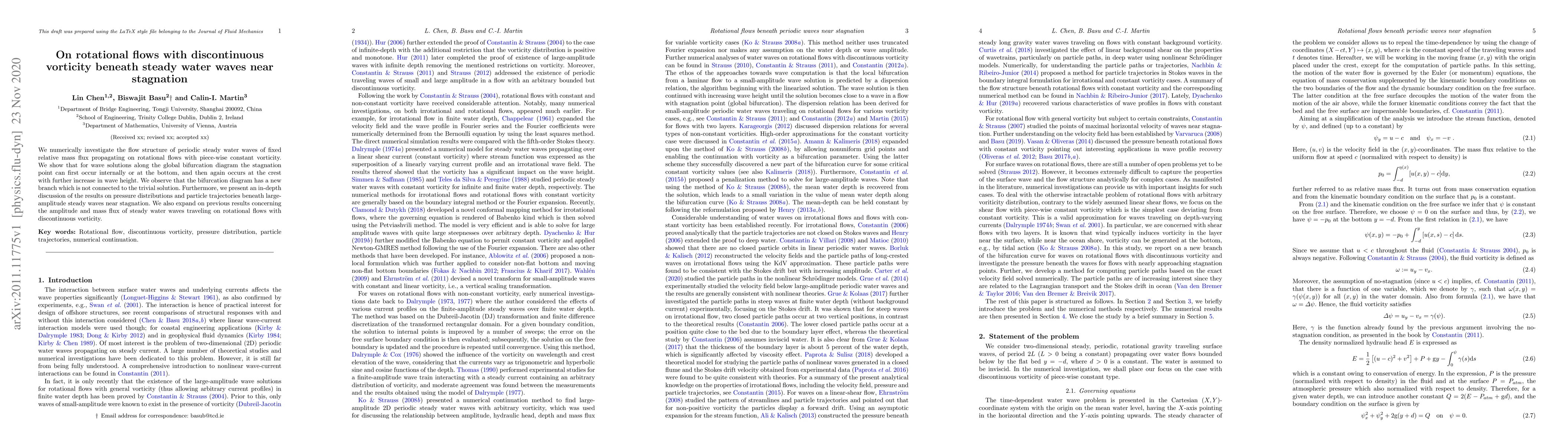 This paper numerically explores the flow structure of steady water waves on rotational flows with discontinuous vorticity, revealing bifurcations leading to stagnation points at different locations. It introduces a new branch in the bifurcation diagram and discusses pressure distributions and particle trajectories beneath large-amplitude waves.
