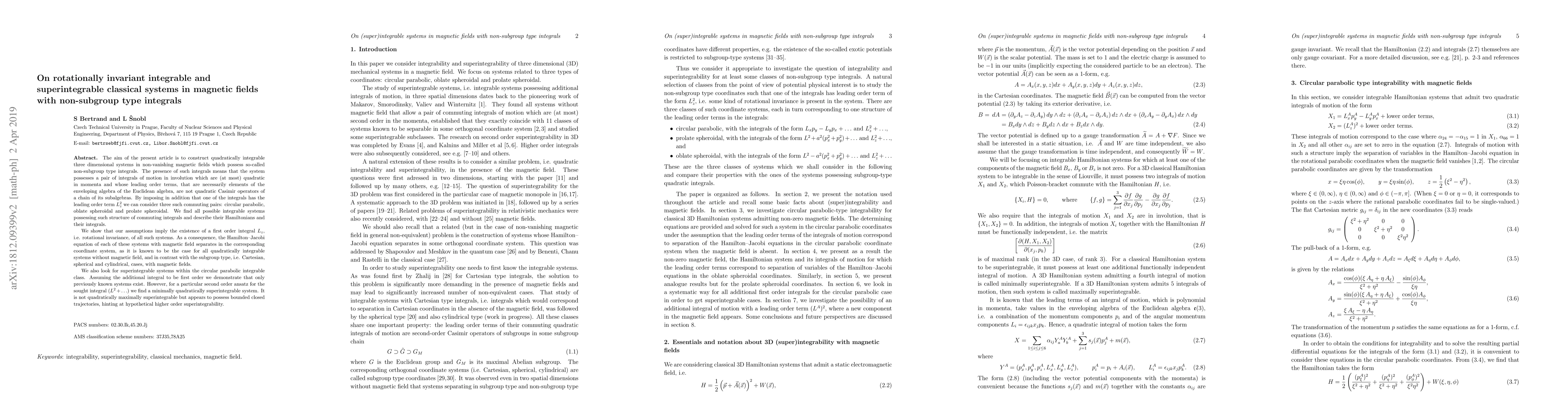 The aim of the present article is to construct quadratically integrable three dimensional systems in non-vanishing magnetic fields which possess so-called non-subgroup type integrals. The presence of such integrals means that the system possesses a pair of integrals of motion in involution which are (at most) quadratic in momenta and whose leading order terms, that are necessarily elements of the enveloping algebra of the Euclidean algebra, are not quadratic Casimir operators of a chain of its subalgebras. By imposing in addition that one of the integrals has the leading order term $L_z^2$ we can consider three such commuting pairs: circular parabolic, oblate spheroidal and prolate spheroidal. We find all possible integrable systems possessing such structure of commuting integrals and describe their Hamiltonians and their integrals. We show that our assumptions imply the existence of a first order integral $L_z $, i.e. rotational invariance, of all such systems. As a consequence, the Hamilton--Jacobi equation of each of these systems with magnetic field separates in the corresponding coordinate system, as it is known to be the case for all quadratically integrable systems without magnetic field, and in contrast with the subgroup type, i.e. Cartesian, spherical and cylindrical, cases, with magnetic fields. We also look for superintegrable systems within the circular parabolic integrable class. Assuming the additional integral to be first order we demonstrate that only previously known systems exist. However, for a particular second order ansatz for the sought integral ($L^2+\ldots$) we find a minimally quadratically superintegrable system. It is not quadratically maximally superintegrable but appears to possess bounded closed trajectories, hinting at hypothetical higher order superintegrability.