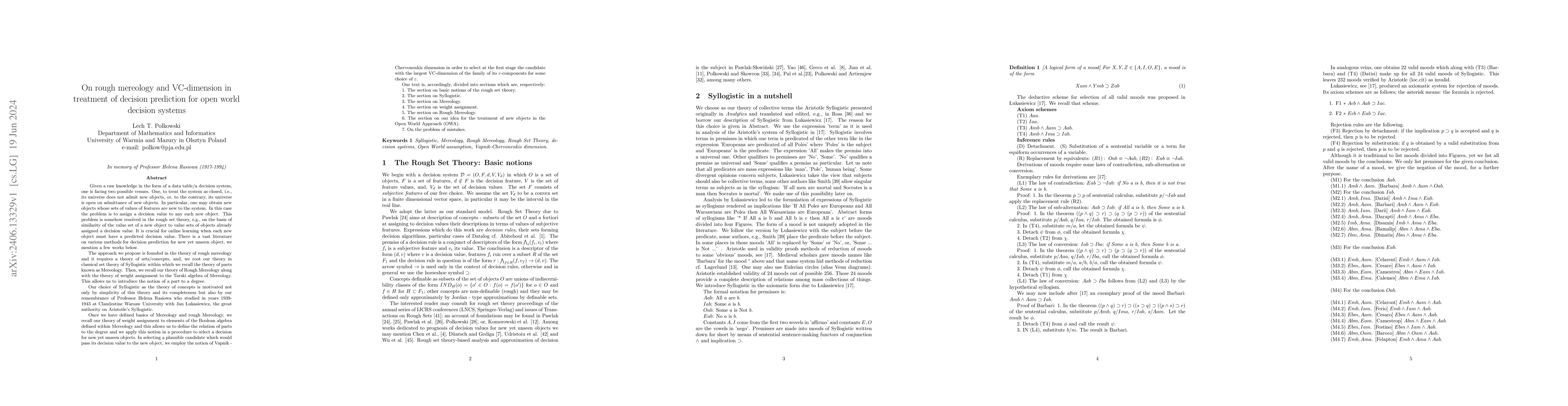Given a raw knowledge in the form of a data table/a decision system, one is facing two possible venues. One, to treat the system as closed, i.e., its universe does not admit new objects, or, to the contrary, its universe is open on admittance of new objects. In particular, one may obtain new objects whose sets of values of features are new to the system. In this case the problem is to assign a decision value to any such new object. This problem is somehow resolved in the rough set theory, e.g., on the basis of similarity of the value set of a new object to value sets of objects already assigned a decision value. It is crucial for online learning when each new object must have a predicted decision value.\ There is a vast literature on various methods for decision prediction for new yet unseen object. The approach we propose is founded in the theory of rough mereology and it requires a theory of sets/concepts, and, we root our theory in classical set theory of Syllogistic within which we recall the theory of parts known as Mereology. Then, we recall our theory of Rough Mereology along with the theory of weight assignment to the Tarski algebra of Mereology.\ This allows us to introduce the notion of a part to a degree. Once we have defined basics of Mereology and rough Mereology, we recall our theory of weight assignment to elements of the Boolean algebra within Mereology and this allows us to define the relation of parts to the degree and we apply this notion in a procedure to select a decision for new yet unseen objects.\ In selecting a plausible candidate which would pass its decision value to the new object, we employ the notion of Vapnik - Chervonenkis dimension in order to select at the first stage the candidate with the largest VC-dimension of the family of its $\varepsilon$-components for some choice of $\varepsilon$.