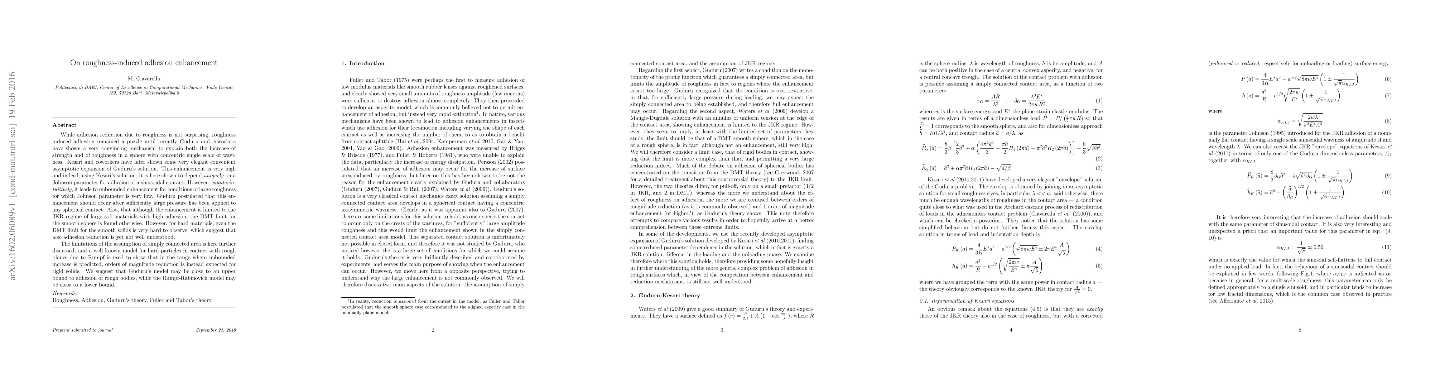 This paper explores the counterintuitive phenomenon of roughness-induced adhesion enhancement, explaining mechanisms behind increased strength and toughness in rough spherical contacts. It discusses limitations of Guduru's model and proposes that Rumpf's model for hard particles provides a more realistic lower bound for adhesion in rigid solids.