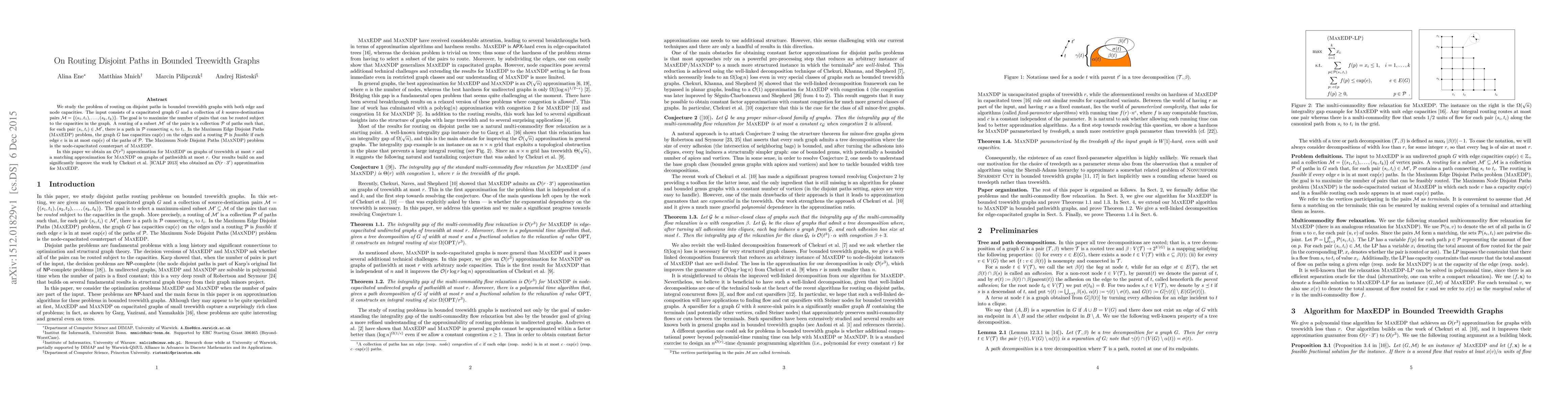 We study the problem of routing on disjoint paths in bounded treewidth graphs with both edge and node capacities. The input consists of a capacitated graph $G$ and a collection of $k$ source-destination pairs $\mathcal{M} = \{(s_1, t_1), \dots, (s_k, t_k)\}$. The goal is to maximize the number of pairs that can be routed subject to the capacities in the graph. A routing of a subset $\mathcal{M}'$ of the pairs is a collection $\mathcal{P}$ of paths such that, for each pair $(s_i, t_i) \in \mathcal{M}'$, there is a path in $\mathcal{P}$ connecting $s_i$ to $t_i$. In the Maximum Edge Disjoint Paths (MaxEDP) problem, the graph $G$ has capacities $\mathrm{cap}(e)$ on the edges and a routing $\mathcal{P}$ is feasible if each edge $e$ is in at most $\mathrm{cap}(e)$ of the paths of $\mathcal{P}$. The Maximum Node Disjoint Paths (MaxNDP) problem is the node-capacitated counterpart of MaxEDP. In this paper we obtain an $O(r^3)$ approximation for MaxEDP on graphs of treewidth at most $r$ and a matching approximation for MaxNDP on graphs of pathwidth at most $r$. Our results build on and significantly improve the work by Chekuri et al. [ICALP 2013] who obtained an $O(r \cdot 3^r)$ approximation for MaxEDP.