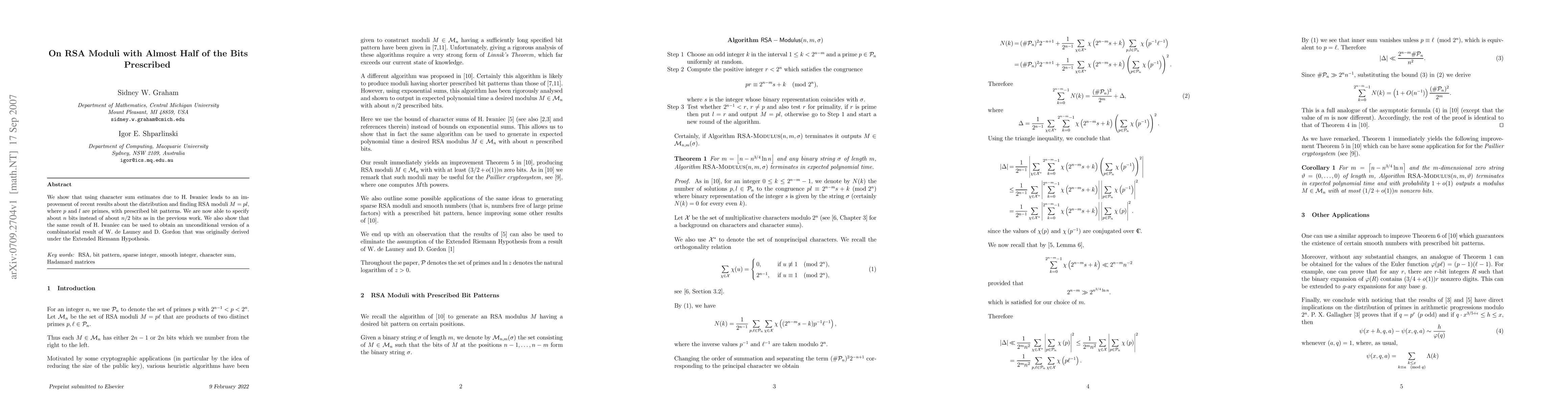 We show that using character sum estimates due to H. Iwaniec leads to an improvement of recent results about the distribution and finding RSA moduli $M=pl$, where $p$ and $l$ are primes, with prescribed bit patterns. We are now able to specify about $n$ bits instead of about $n/2$ bits as in the previous work. We also show that the same result of H. Iwaniec can be used to obtain an unconditional version of a combinatorial result of W. de Launey and D. Gordon that was originally derived under the Extended Riemann Hypothesis.