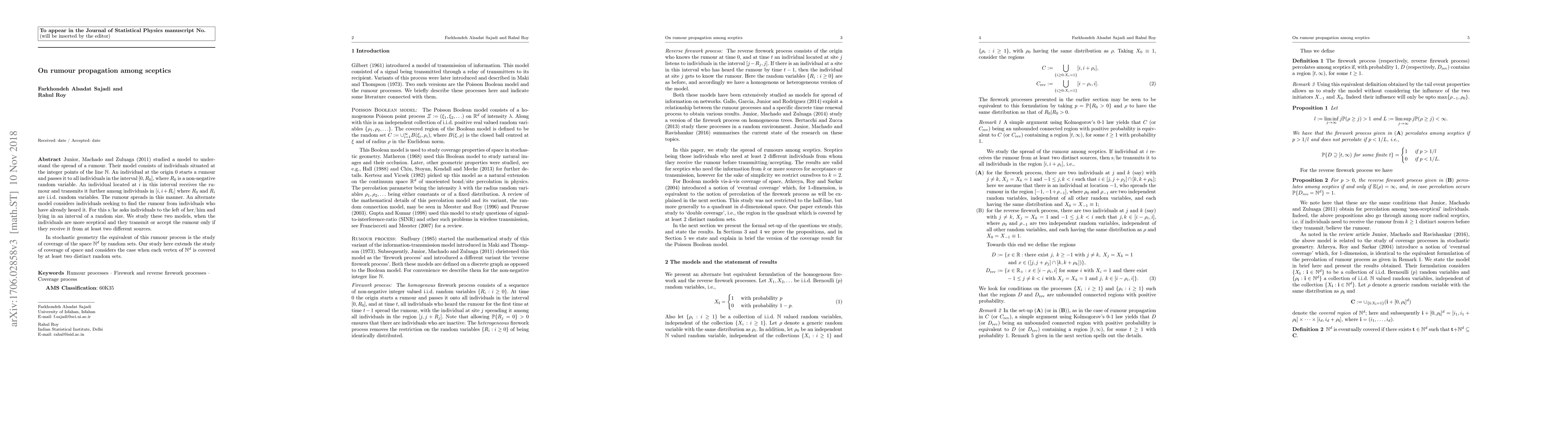 Junior, Machado and Zuluaga (2011) studied a model to understand the spread of a rumour. Their model consists of individuals situated at the integer points of the line $\N$. An individual at the origin $0$ starts a rumour and passes it to all individuals in the interval $[0,R_0]$, where $R_0$ is a non-negative random variable. An individual located at $i$ in this interval receives the rumour and transmits it further among individuals in $[i, i+R_i]$ where $R_0$ and $R_i$ are i.i.d. random variables. The rumour spreads in this manner. An alternate model considers individuals seeking to find the rumour from individuals who have already heard it. For this s/he asks individuals to the left of her/him and lying in an interval of a random size. We study these two models, when the individuals are more sceptical and they transmit or accept the rumour only if they receive it from at least two different sources. In stochastic geometry the equivalent of this rumour process is the study of coverage of the space $\N^d$ by random sets. Our study here extends the study of coverage of space and considers the case when each vertex of $\N^d$ is covered by at least two distinct random sets.