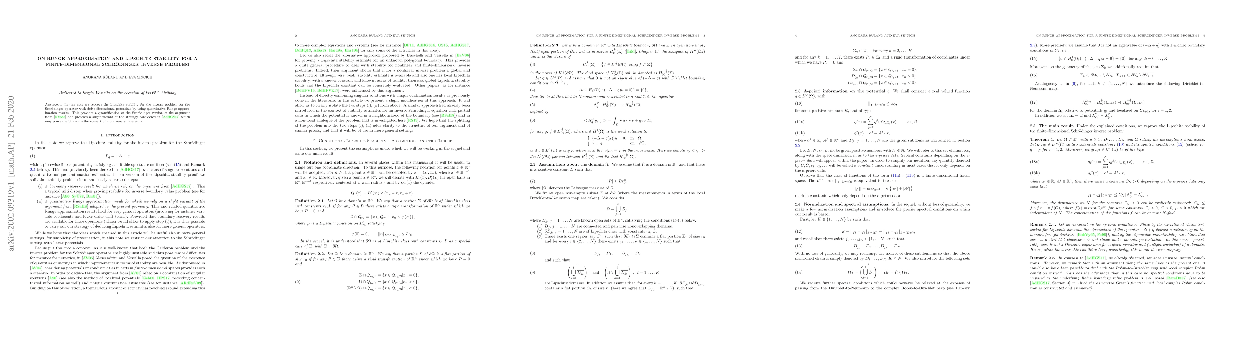 Summary: This paper reproves Lipschitz stability for the inverse problem of the Schrödinger operator with finite-dimensional potentials using quantitative Runge approximation, offering a new perspective on the Kohn-Vogelius argument and a refined strategy applicable to broader operator contexts.