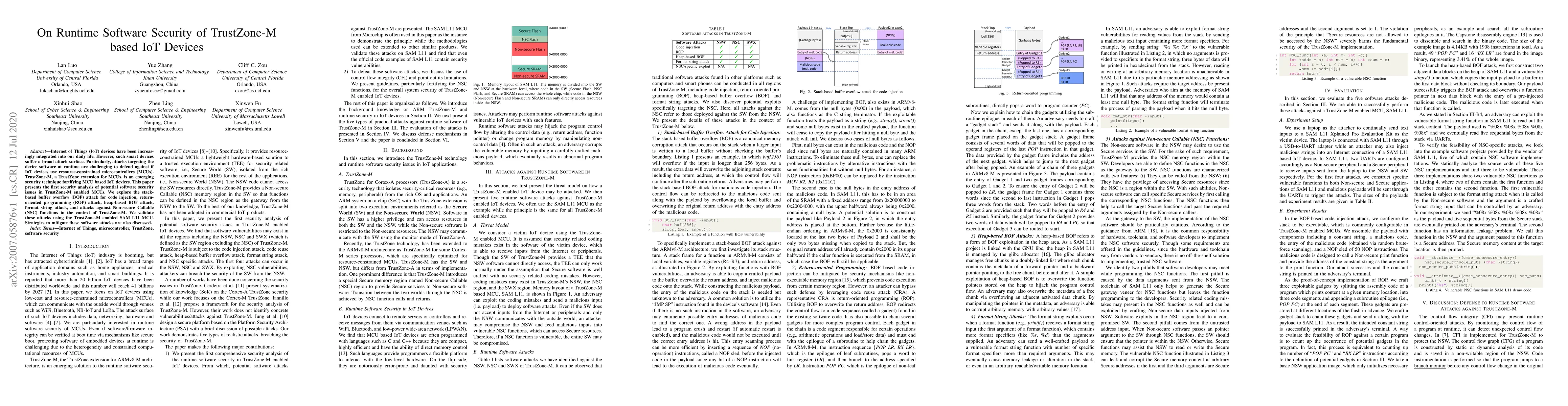 This paper conducts a security analysis of TrustZone-M enabled IoT devices, identifying potential runtime software vulnerabilities such as buffer overflow, ROP, and attacks against Non-secure Callable functions. Mitigation strategies are proposed to defend against these threats.
