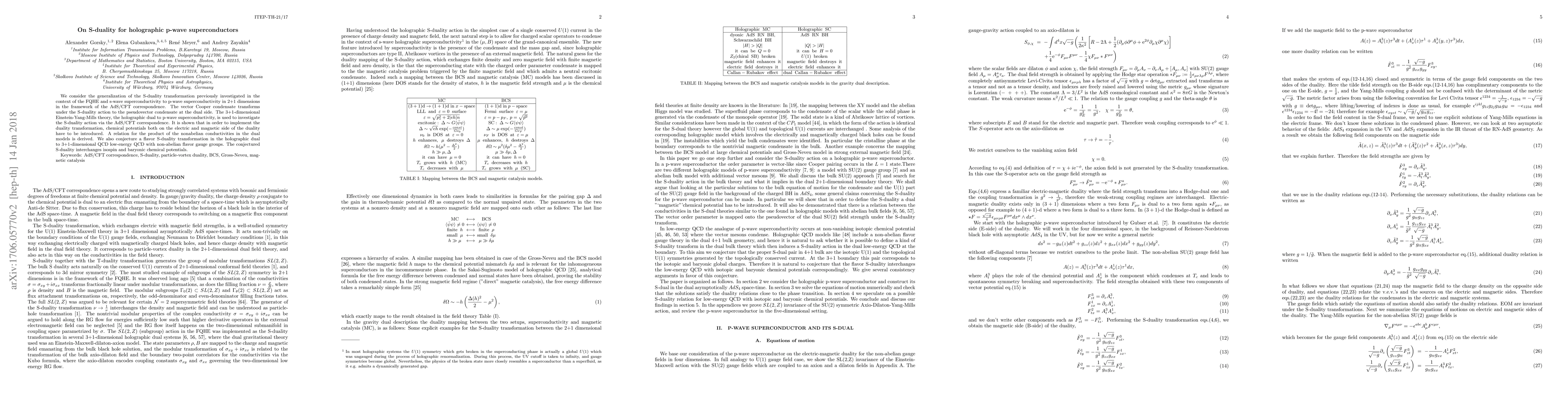 This paper explores the S-duality transformation in the context of p-wave superconductivity in 2+1 dimensions using the AdS/CFT correspondence, showing that the vector Cooper condensate transforms to a pseudovector condensate. It also introduces chemical potentials for both electric and magnetic sides and proposes a flavor S-duality in the holographic dual to 3+1-dimensional QCD, interchanging isospin and baryonic chemical potentials.