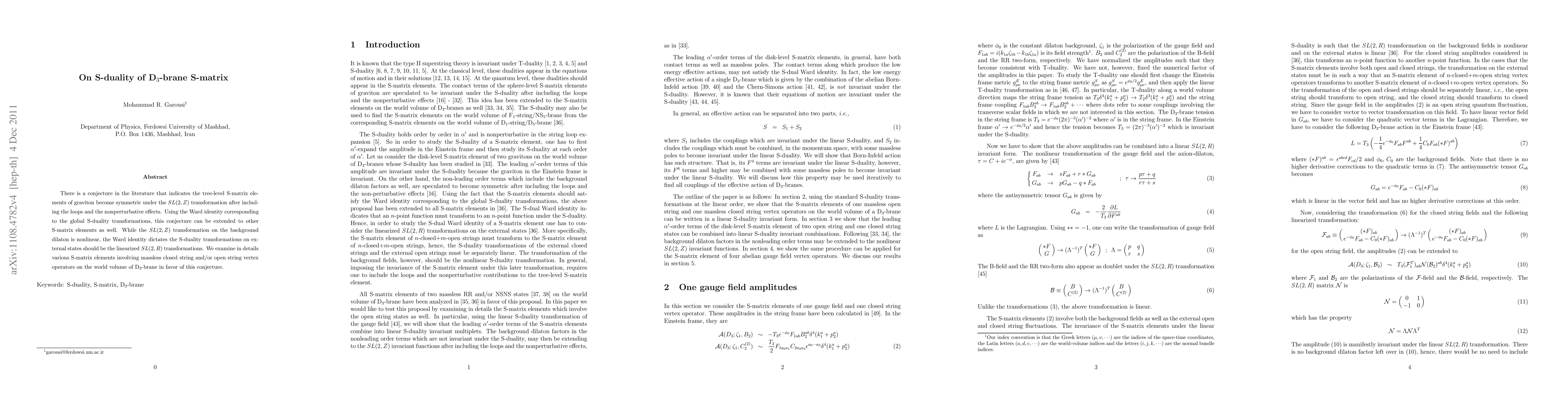 This paper explores the conjecture that the tree-level S-matrix elements of gravitons exhibit $SL(2,Z)$ symmetry after incorporating loops and nonperturbative effects. It extends this conjecture to other S-matrix elements via the Ward identity, examining various D$_3$-brane S-matrix elements to support the proposed S-duality.