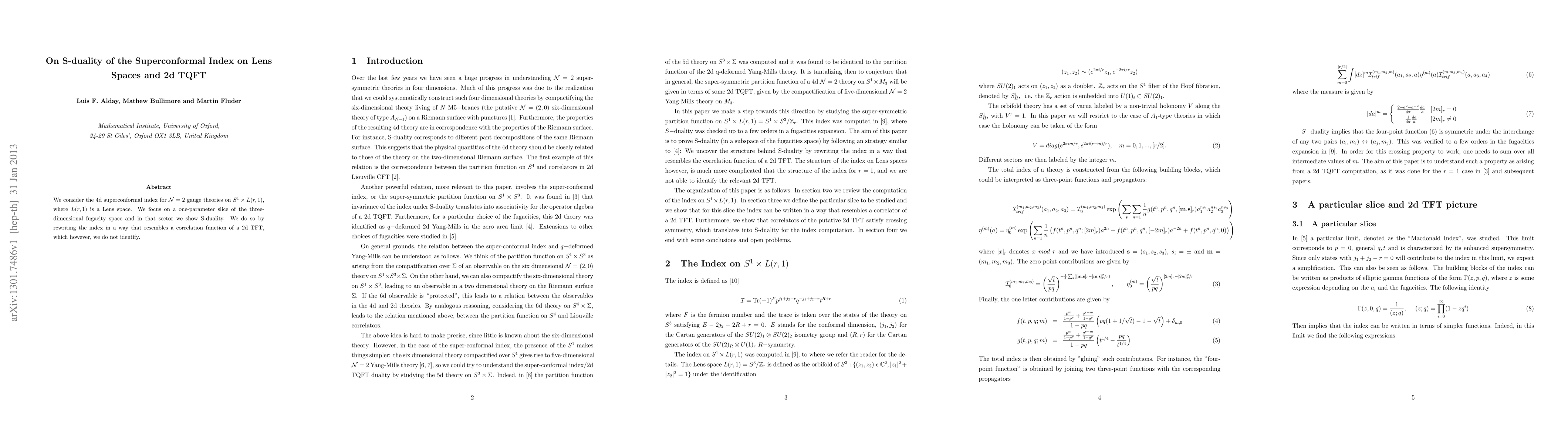 This paper explores the 4d superconformal index for ${\cal N}=2$ gauge theories on $S^1 \times L(r,1)$ and demonstrates S-duality within a specific fugacity sector by reformulating the index to resemble a 2d topological field theory correlation function.