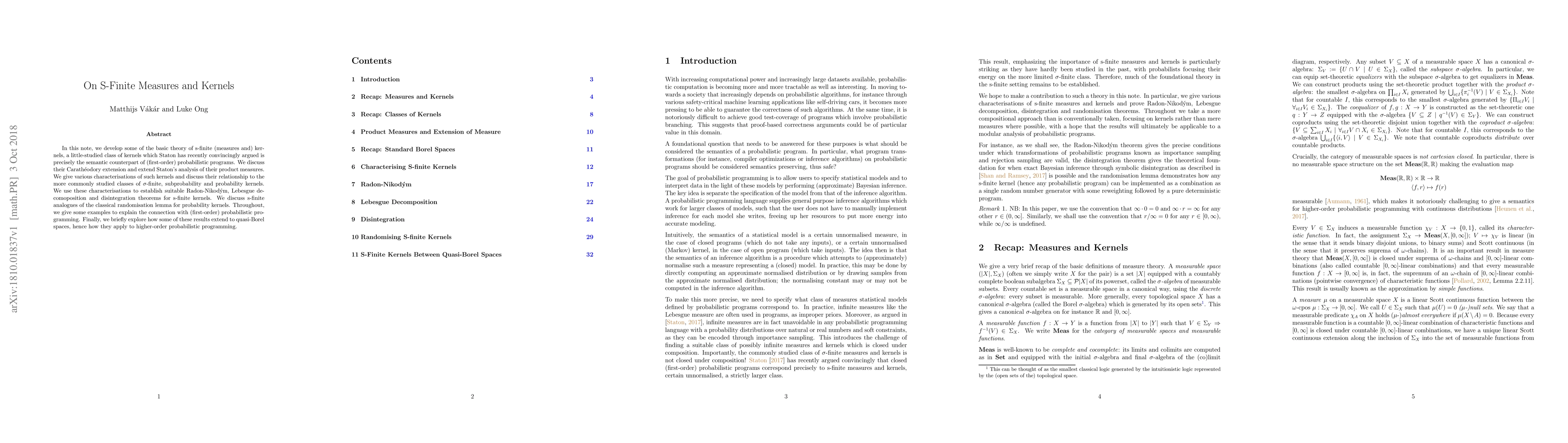This paper develops basic theory for s-finite measures and kernels, a class of kernels analogous to probabilistic programs, with implications for higher-order probabilistic programming.