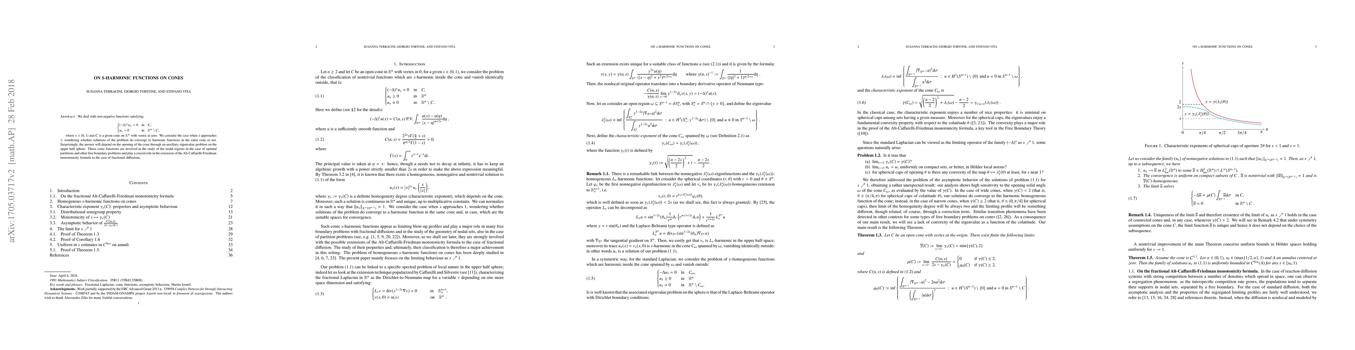 This paper investigates the behavior of s-harmonic functions on cones as the parameter \(s\) approaches \(1\), exploring whether these functions converge to harmonic functions. The study reveals that convergence depends on the cone's opening, determined by an eigenvalue problem on the upper half sphere, and highlights the functions' significance in optimal partitions and fractional diffusions.
