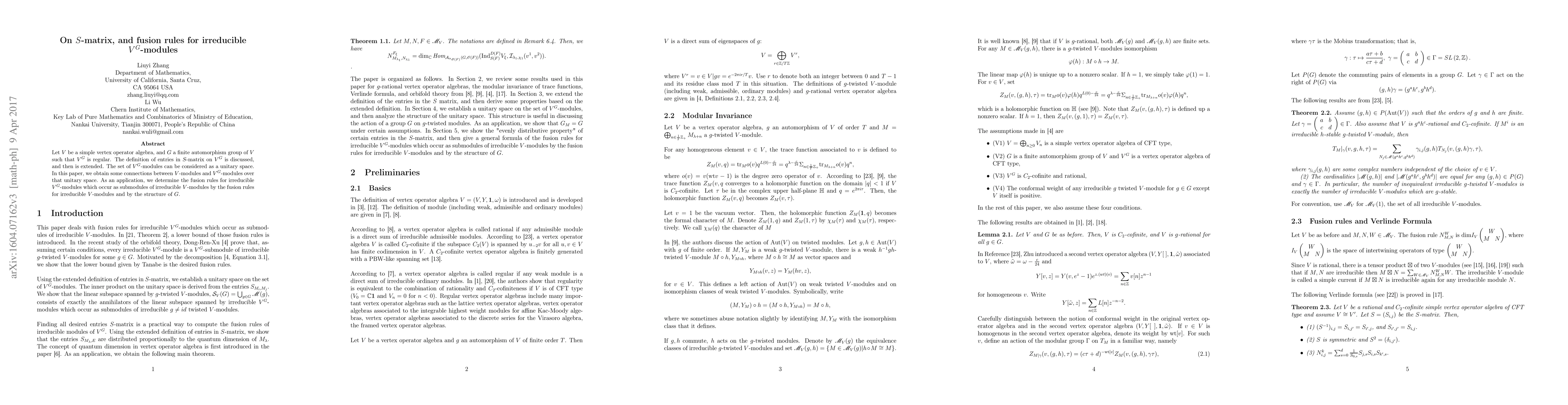 Let $V$ be a simple vertex operator algebra, and $G$ a finite automorphism group of $V$ such that $V^G$ is regular. The definition of entries in $S$-matrix on $V^G$ is discussed, and then is extended. The set of $V^G$-modules can be considered as a unitary space. In this paper, we obtain some connections between $V$-modules and $V^G$-modules over that unitary space. As an application, we determine the fusion rules for irreducible $V^G$-modules which occur as submodules of irreducible $V$-modules by the fusion rules for irreducible $V$-modules and by the structure of $G$.