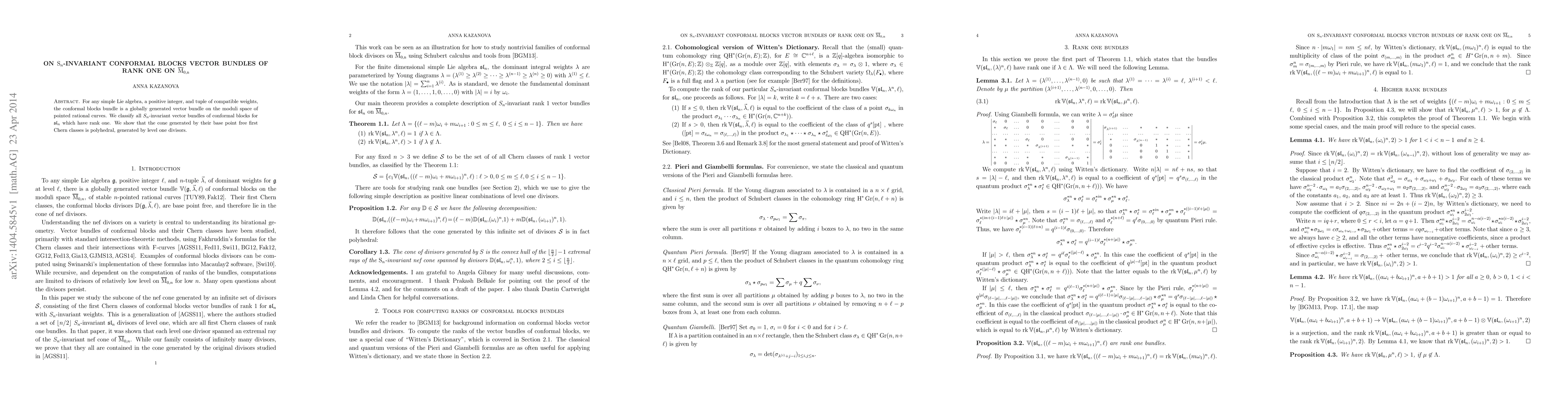 This paper classifies $S_n$-invariant rank one vector bundles of conformal blocks on $\overline M_{0,n}$ for $\mathfrak{sl}_n$, showing their first Chern classes generate a polyhedral cone spanned by level one divisors.