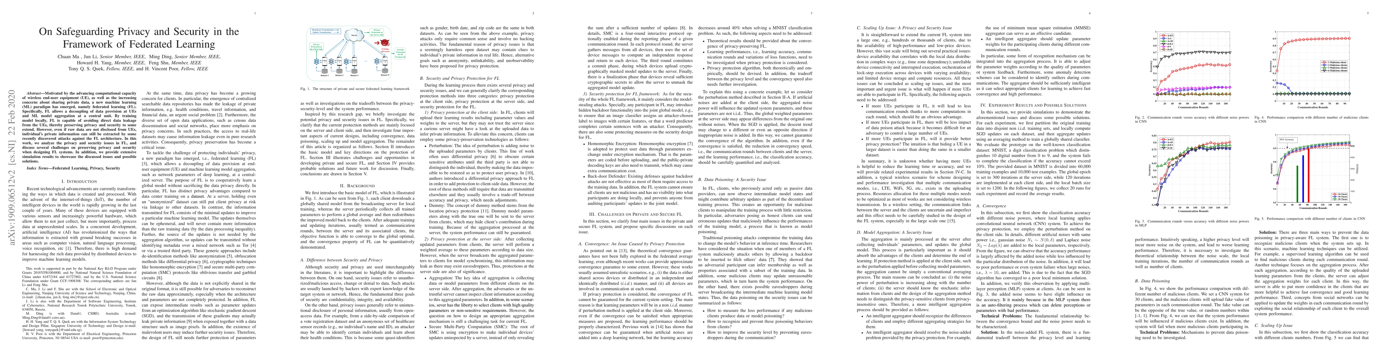 Motivated by the advancing computational capacity of wireless end-user equipment (UE), as well as the increasing concerns about sharing private data, a new machine learning (ML) paradigm has emerged, namely federated learning (FL). Specifically, FL allows a decoupling of data provision at UEs and ML model aggregation at a central unit. By training model locally, FL is capable of avoiding data leakage from the UEs, thereby preserving privacy and security to some extend. However, even if raw data are not disclosed from UEs, individual's private information can still be extracted by some recently discovered attacks in the FL architecture. In this work, we analyze the privacy and security issues in FL, and raise several challenges on preserving privacy and security when designing FL systems. In addition, we provide extensive simulation results to illustrate the discussed issues and possible solutions.