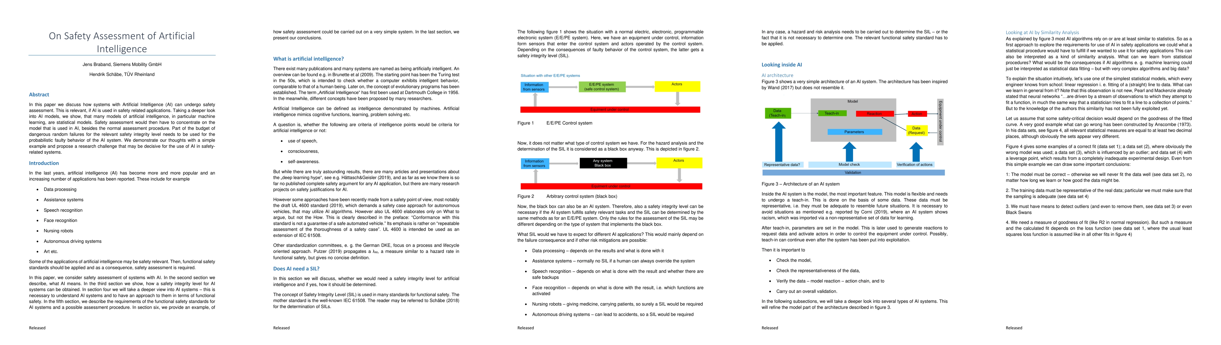 In this paper we discuss how systems with Artificial Intelligence (AI) can undergo safety assessment. This is relevant, if AI is used in safety related applications. Taking a deeper look into AI models, we show, that many models of artificial intelligence, in particular machine learning, are statistical models. Safety assessment would then have t o concentrate on the model that is used in AI, besides the normal assessment procedure. Part of the budget of dangerous random failures for the relevant safety integrity level needs to be used for the probabilistic faulty behavior of the AI system. We demonstrate our thoughts with a simple example and propose a research challenge that may be decisive for the use of AI in safety related systems.