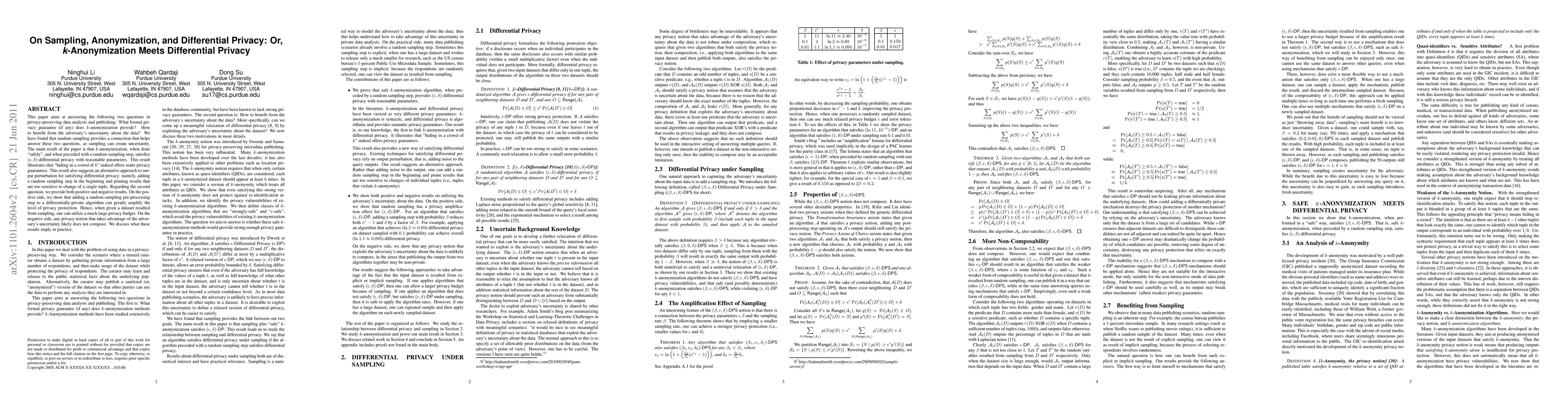 This paper investigates the privacy guarantees of $k$-anonymization and the benefits of uncertainty introduced by random sampling in privacy-preserving data analysis. It finds that $k$-anonymization, when coupled with random sampling, satisfies $(\epsilon,\delta)$-differential privacy. It also shows that random sampling can significantly enhance privacy protection when used before differentially private algorithms, though it notes that privacy notions leveraging uncertainty do not compose well.