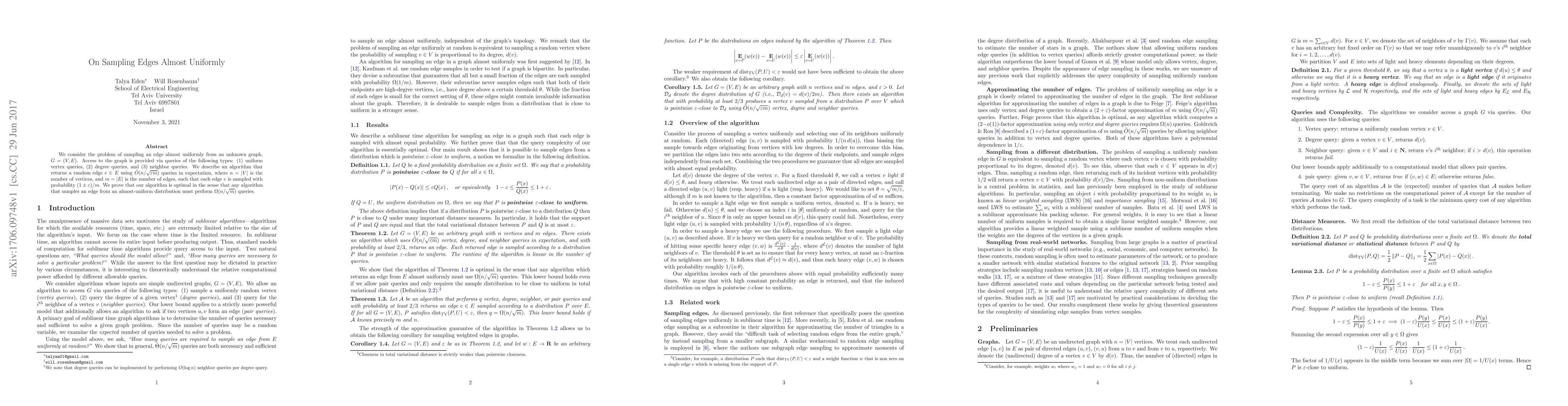 This work introduces an efficient algorithm for almost uniform edge sampling that improves upon previous models by allowing additional query types and providing a tighter analysis of query complexity.