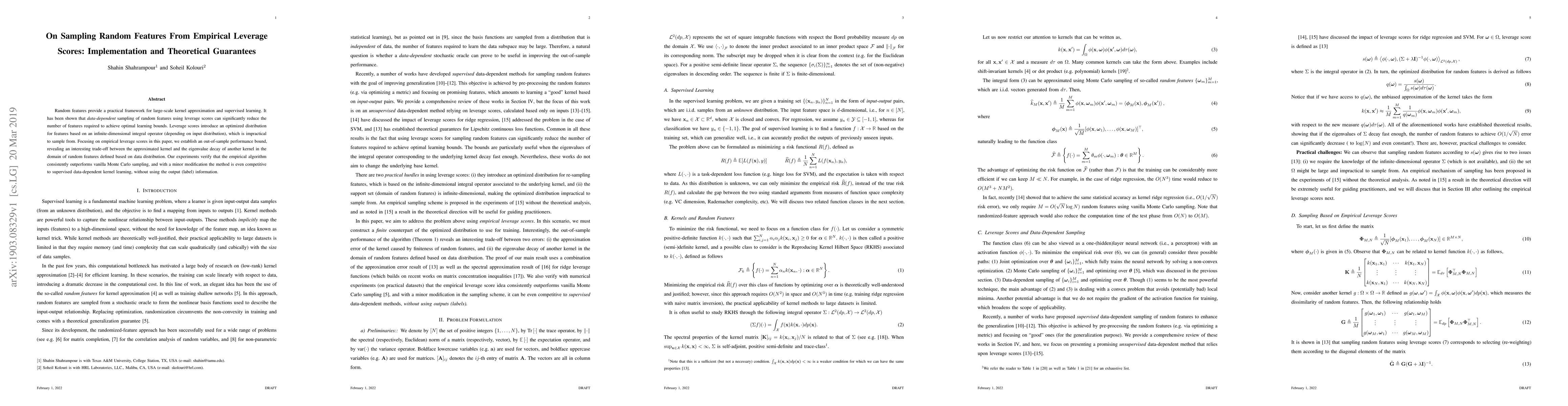 This paper explores the use of random features for kernel approximation and supervised learning, focusing on leveraging empirical leverage scores to reduce feature sampling. It establishes theoretical guarantees and demonstrates through experiments that empirical leverage score sampling outperforms standard Monte Carlo sampling and is competitive with supervised methods.