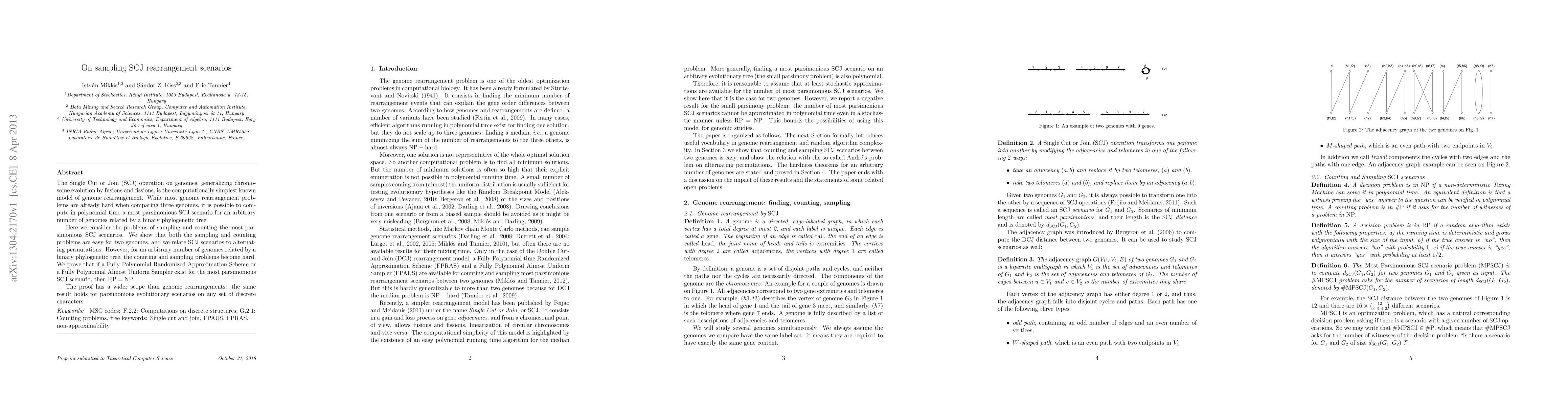 This paper explores the computational complexity of sampling and counting the most parsimonious Single Cut or Join (SCJ) genome rearrangement scenarios. While easy for two genomes, it proves that these problems become intractable for more genomes related by a binary phylogenetic tree, implying that solving them efficiently would collapse complexity classes.