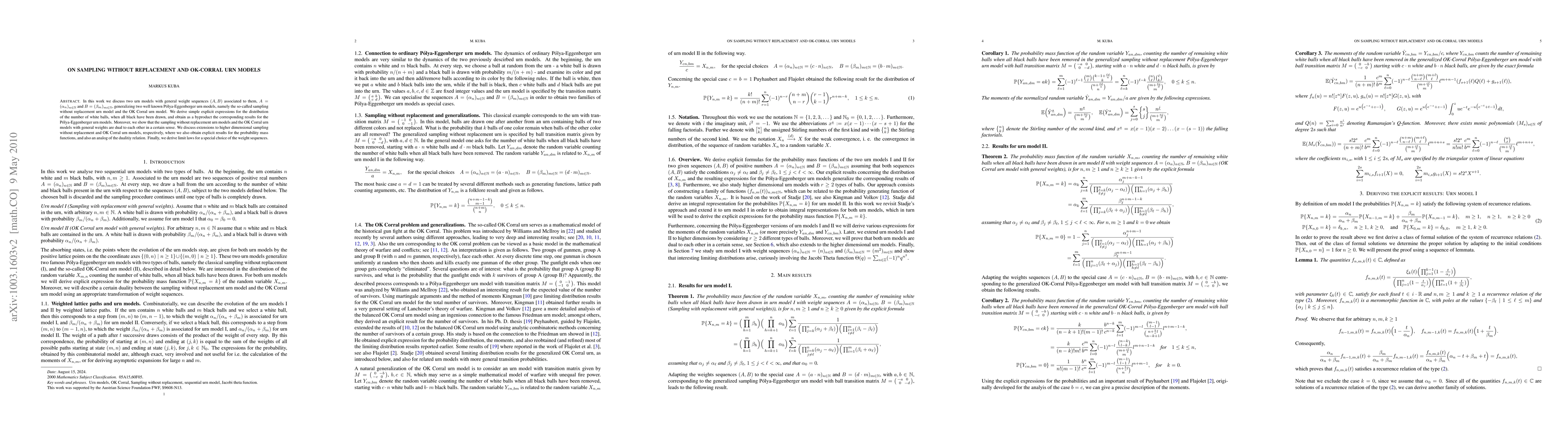 In this work we discuss two urn models with general weight sequences $(A,B)$ associated to them, $A=(\alpha_n)_{n\in\N}$ and $B=(\beta_m)_{m\in\N}$, generalizing two well known P\'olya-Eggenberger urn models, namely the so-called sampling without replacement urn model and the OK Corral urn model. We derive simple explicit expressions for the distribution of the number of white balls, when all black have been drawn, and obtain as a byproduct the corresponding results for the P\'olya-Eggenberger urn models. Moreover, we show that the sampling without replacement urn models and the OK Corral urn models with general weights are dual to each other in a certain sense. We discuss extensions to higher dimensional sampling without replacement and OK Corral urn models, respectively, where we also obtain explicit results for the probability mass functions, and also an analog of the dualitiy relation. Finally, we derive limit laws for a special choice of the weight sequences.