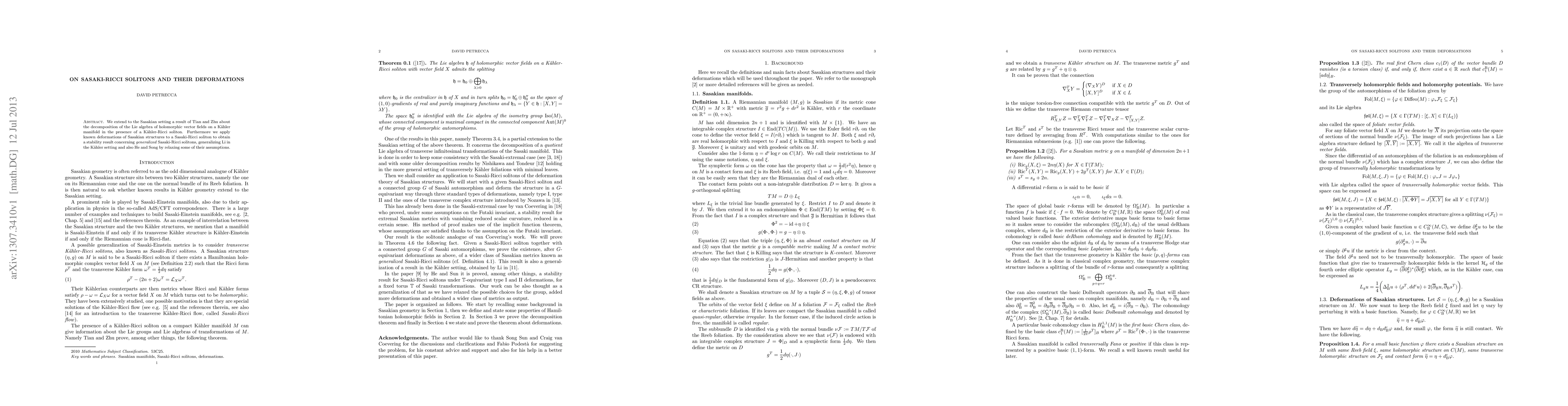 We extend to the Sasakian setting a result of Tian and Zhu about the decomposition of the Lie algebra of holomorphic vector fields on a K\"ahler manifold in the presence of a K\"ahler-Ricci soliton. Furthermore we apply known deformations of Sasakian structures to a Sasaki-Ricci soliton to obtain a stability result concerning \emph{generalized} Sasaki-Ricci solitons, generalizing Li in the K\"ahler setting and also He and Song by relaxing some of their assumptions.