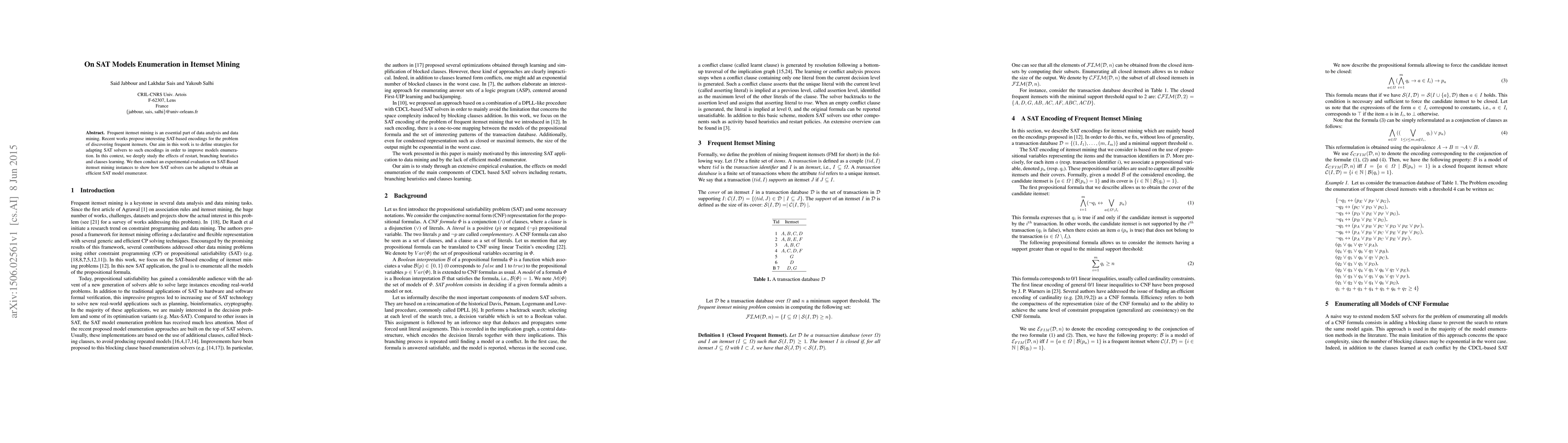This paper explores strategies to adapt SAT solvers for efficient enumeration of frequent itemset models in data mining, focusing on the effects of restart, branching heuristics, and clause learning. Experimental results demonstrate the effectiveness of these adaptations in SAT-based itemset mining.