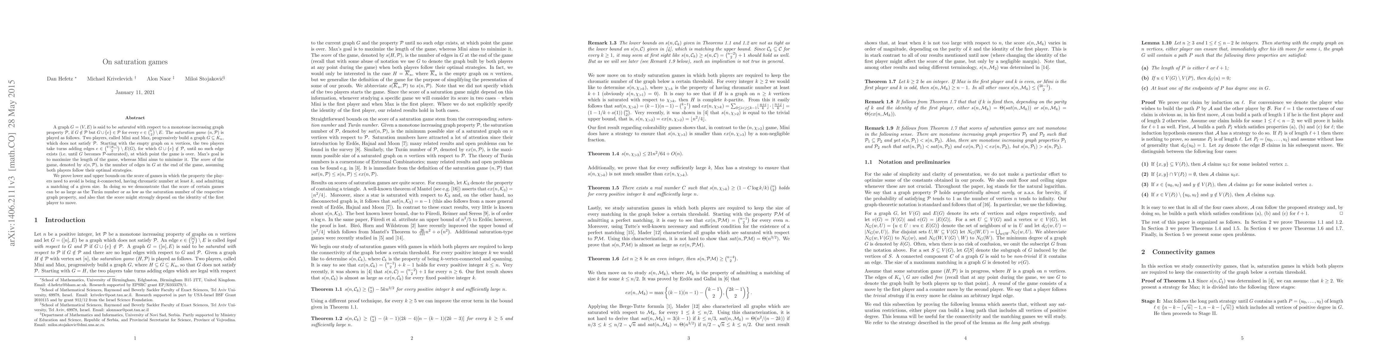 This paper studies saturation games where players build a graph avoiding a specific monotone property until it becomes saturated. It provides bounds on the game's score for properties like $k$-connectivity, chromatic number, and matching size, showing the score can vary significantly based on the property and the first player's identity.