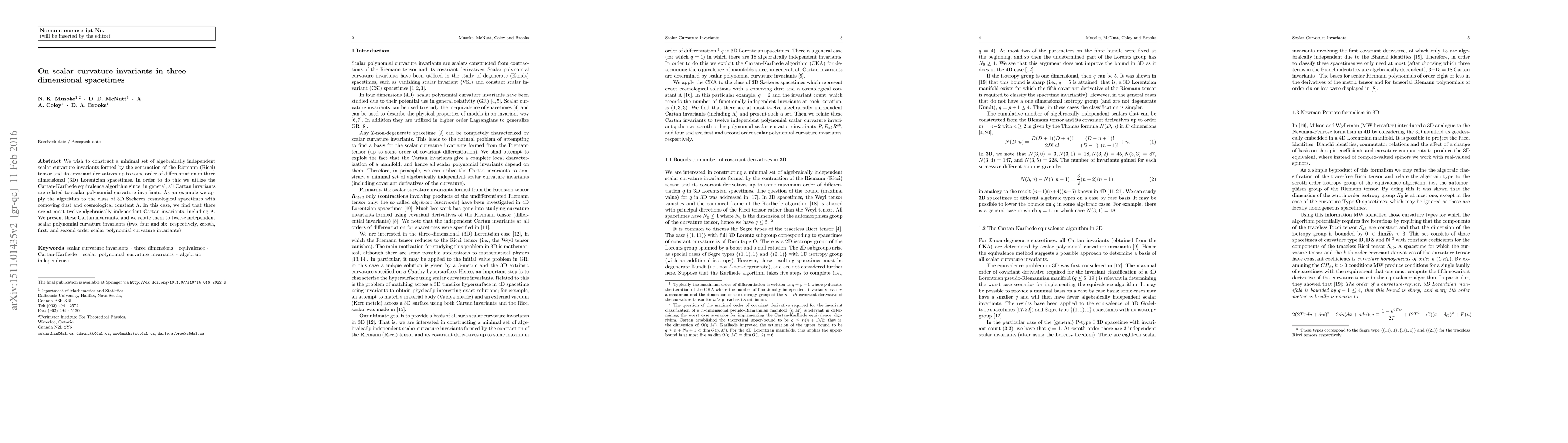We wish to construct a minimal set of algebraically independent scalar curvature invariants formed by the contraction of the Riemann (Ricci) tensor and its covariant derivatives up to some order of differentiation in three dimensional (3D) Lorentzian spacetimes. In order to do this we utilize the Cartan-Karlhede equivalence algorithm since, in general, all Cartan invariants are related to scalar polynomial curvature invariants. As an example we apply the algorithm to the class of 3D Szekeres cosmological spacetimes with comoving dust and cosmological constant $\Lambda$. In this case, we find that there are at most twelve algebraically independent Cartan invariants, including $\Lambda$. We present these Cartan invariants, and we relate them to twelve independent scalar polynomial curvature invariants (two, four and six, respectively, zeroth, first, and second order scalar polynomial curvature invariants).