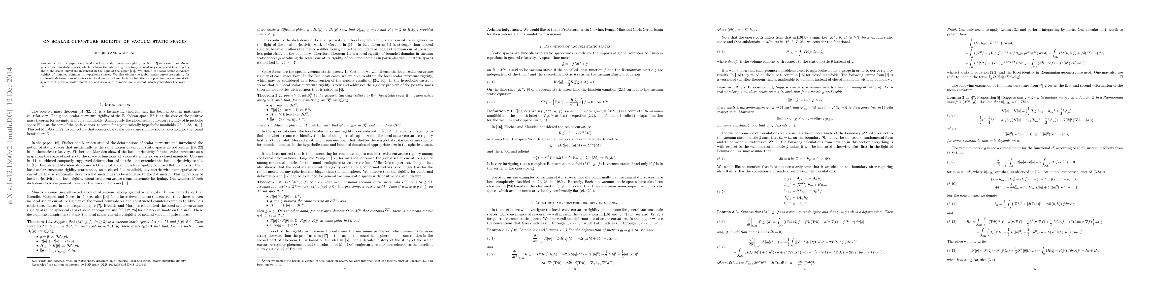 This paper extends the local scalar curvature rigidity result to small domains in general vacuum static spaces, confirming the dichotomy of local surjectivity and local rigidity. It establishes local rigidity for bounded domains in hyperbolic spaces and global rigidity for conformal deformations in vacuum static spaces with positive scalar curvature, proving such domains to be maximal.