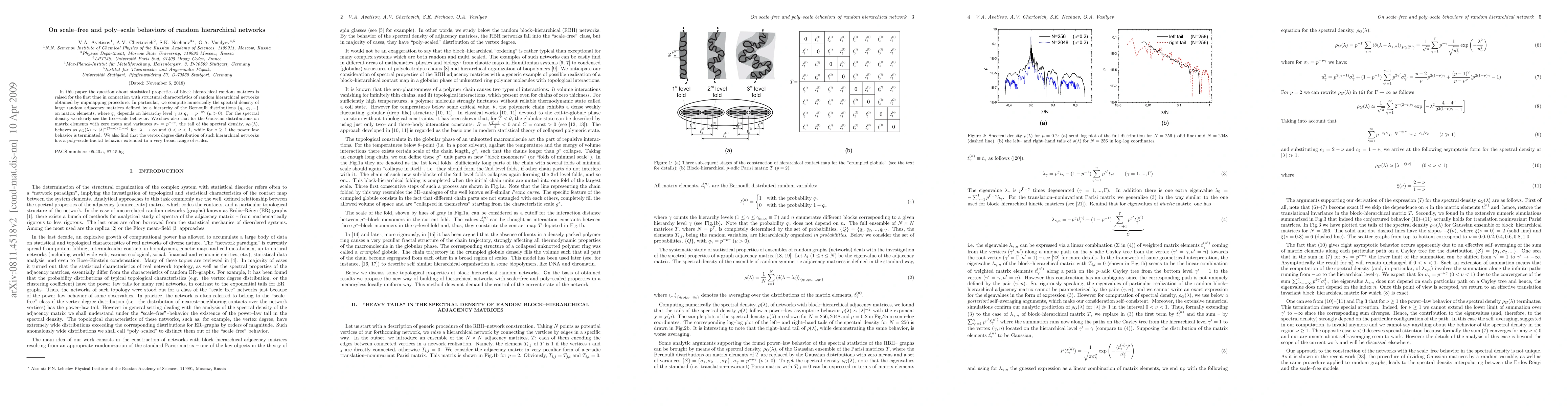 This paper investigates the statistical properties of block-hierarchical random matrices linked to random hierarchical networks. It finds scale-free behavior in the spectral density and poly-scale fractal behavior in the vertex degree distribution across a wide range of scales.