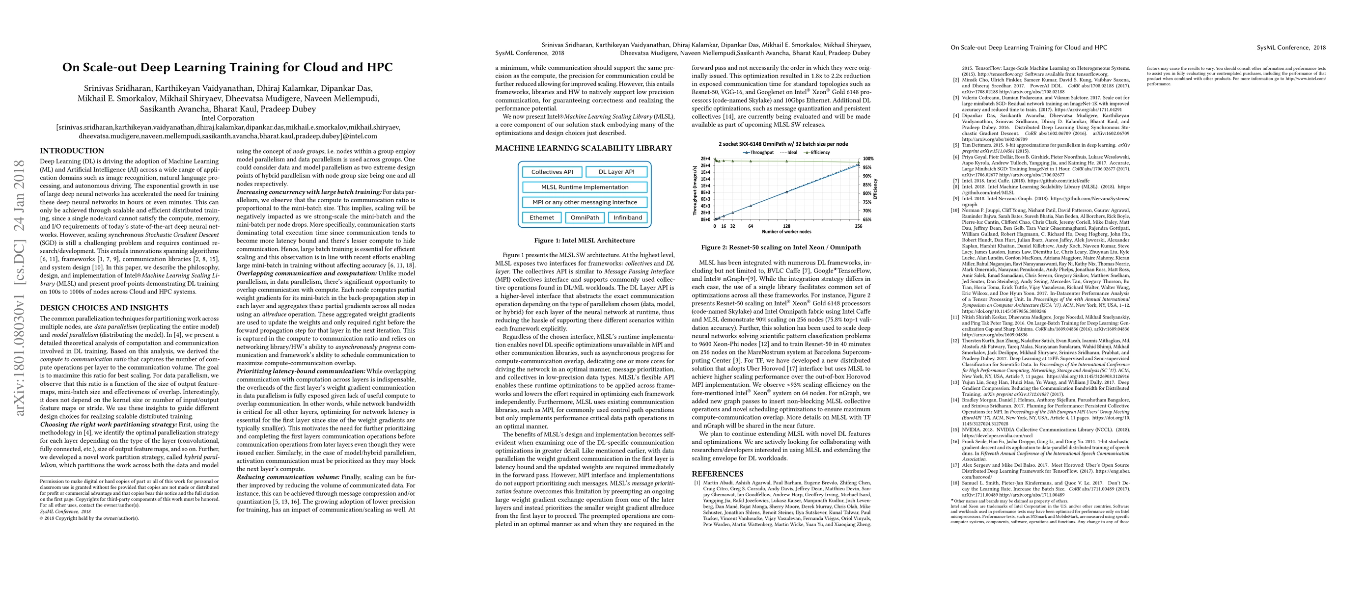 This paper discusses the challenges of scaling deep learning training for large neural networks and introduces the Intel Machine Learning Scalability Library (MLSL). It presents the design and implementation of the library, demonstrating its effectiveness in scaling distributed training across hundreds to thousands of nodes in cloud and high-performance computing environments.