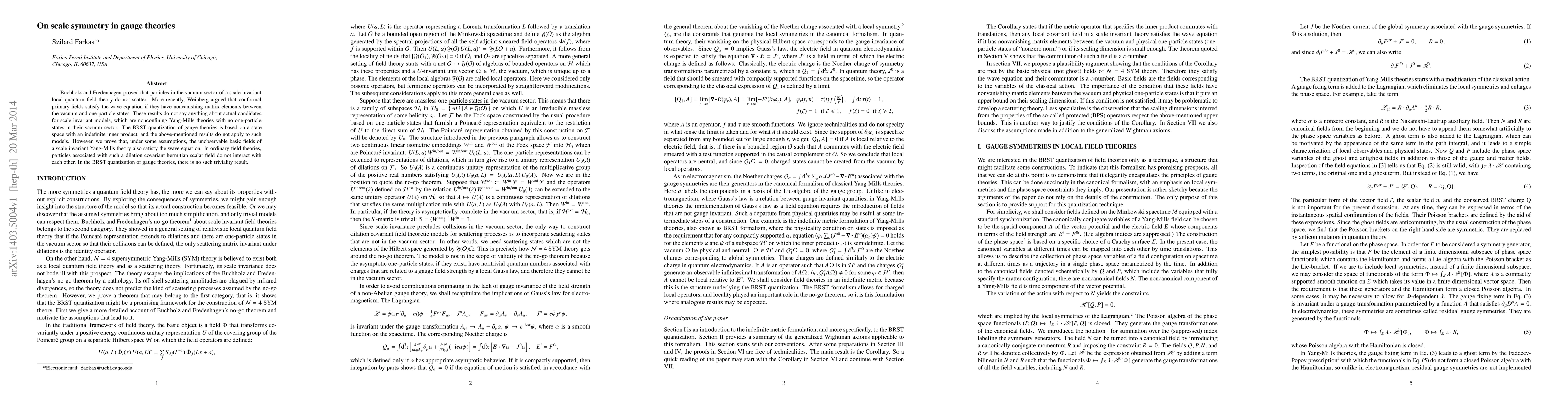 Buchholz and Fredenhagen proved that particles in the vacuum sector of a scale invariant local quantum field theory do not scatter. More recently, Weinberg argued that conformal primary fields satisfy the wave equation if they have nonvanishing matrix elements between the vacuum and one-particle states. These results do not say anything about actual candidates for scale invariant models, which are nonconfining Yang-Mills theories with no one-particle states in their vacuum sector. The BRST quantization of gauge theories is based on a state space with an indefinite inner product, and the above-mentioned results do not apply to such models. However, we prove that, under some assumptions, the unobservable basic fields of a scale invariant Yang-Mills theory also satisfy the wave equation. In ordinary field theories, particles associated with such a dilation covariant hermitian scalar field do not interact with each other. In the BRST quantization of gauge theories, there is no such triviality result.