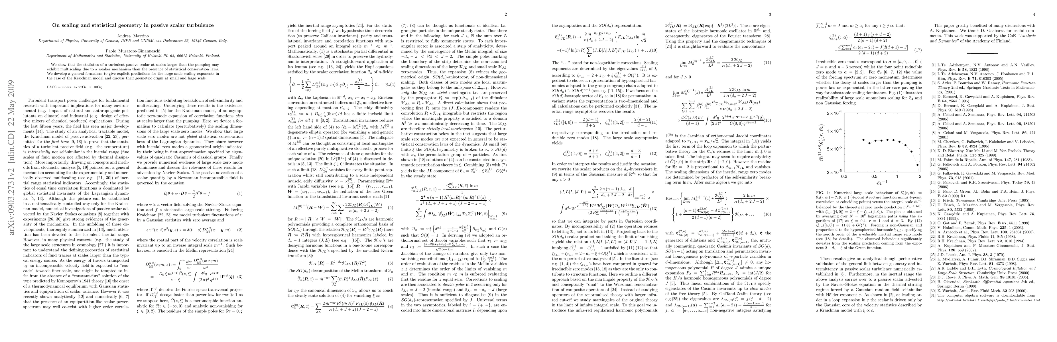 This paper explores the multiscaling behavior in turbulent passive scalars larger than the pumping scale, revealing that it arises from mechanisms other than statistical conservation laws. It proposes a formalism to predict large-scale scaling exponents and analyzes their geometric origins in the Kraichnan model.