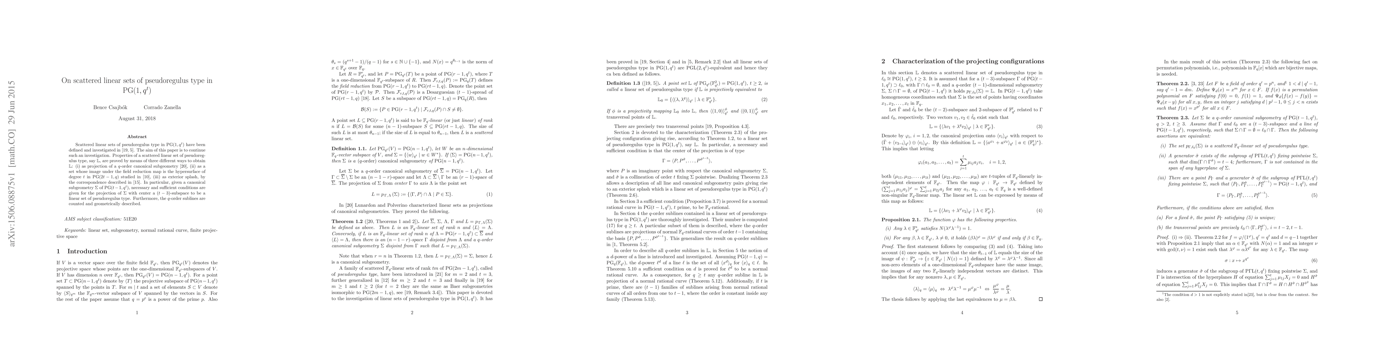 This paper investigates scattered linear sets of pseudoregulus type in $\mathrm{PG}(1,q^t)$, proving properties of such sets $L$ through three distinct derivations: projection of a $q$-order canonical subgeometry, field reduction map, and exterior splash. Necessary and sufficient conditions for the projection of a canonical subgeometry are provided, along with a count and geometric description of $q$-order sublines.