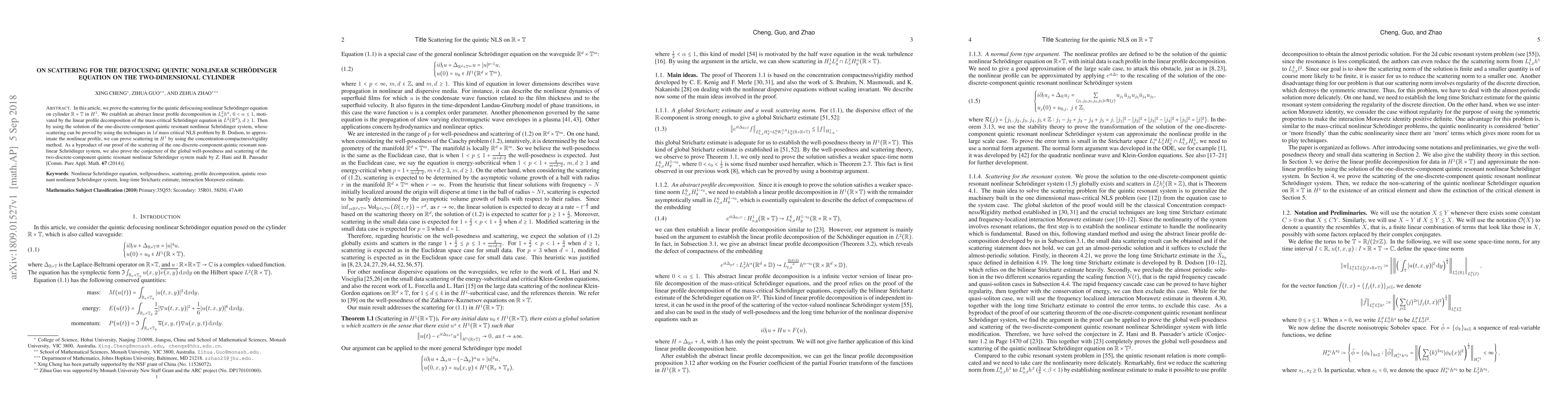 This paper proves scattering for the quintic defocusing nonlinear Schrödinger equation on the cylinder $\mathbb{R} \times \mathbb{T}$ in $H^1$ norm. It uses a linear profile decomposition and the concentration-compactness/rigidity method to establish scattering, leveraging techniques from the 1d mass-critical NLS problem.