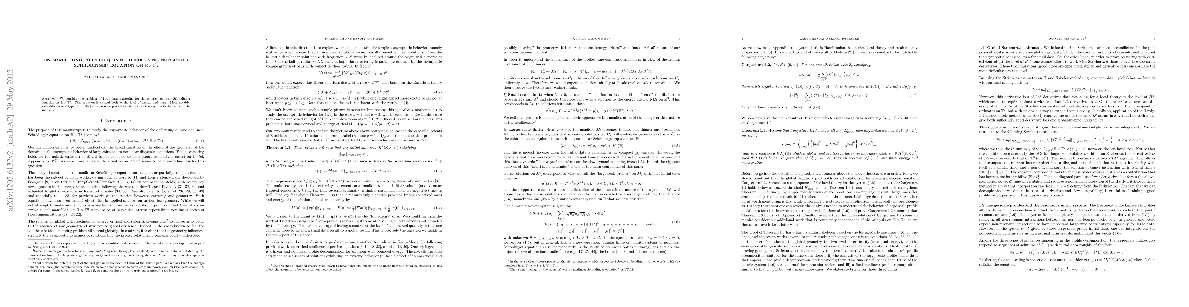 Summary: This paper investigates large data scattering for the critical quintic nonlinear Schrödinger equation on $\R \times \T^2$, revealing a novel "large scale profile" that governs the asymptotic behavior of solutions. The study highlights the unique challenges posed by the equation's critical scaling in terms of energy and mass.
