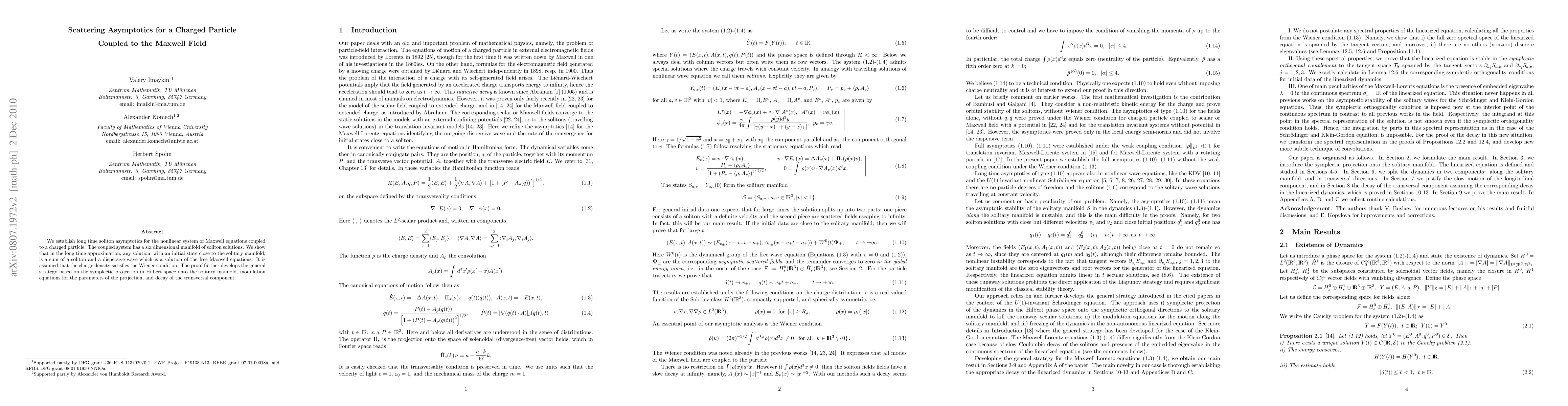 We establish long time soliton asymptotics for the nonlinear system of Maxwell equations coupled to a charged particle. The coupled system has a six dimensional manifold of soliton solutions. We show that in the long time approximation, any solution, with an initial state close to the solitary manifold, is a sum of a soliton and a dispersive wave which is a solution of the free Maxwell equations. It is assumed that the charge density satisfies the Wiener condition. The proof further develops the general strategy based on the symplectic projection in Hilbert space onto the solitary manifold, modulation equations for the parameters of the projection, and decay of the transversal component.