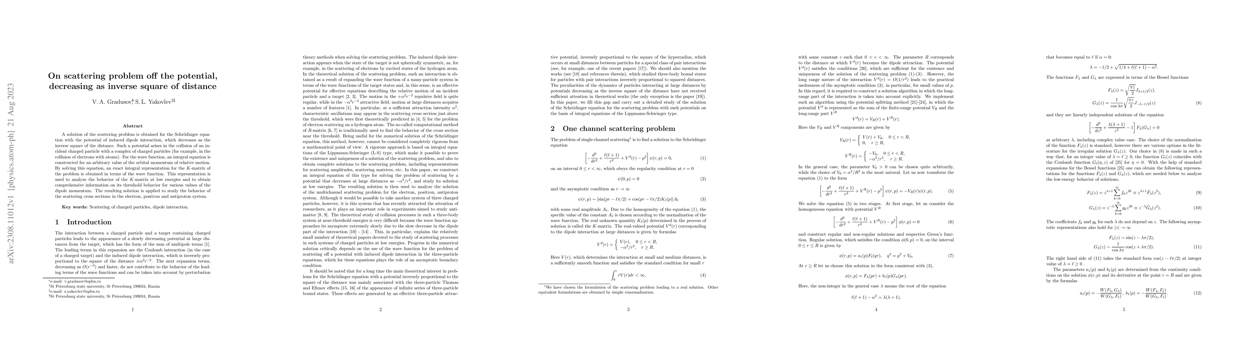 This paper provides a solution to the scattering problem for the Schrödinger equation with an inverse square distance potential arising from induced dipole interactions, constructing an integral equation for the wave function. The study analyzes the $K$-matrix behavior at low energies and applies the results to investigate scattering cross sections in electron, positron, and antiproton systems.