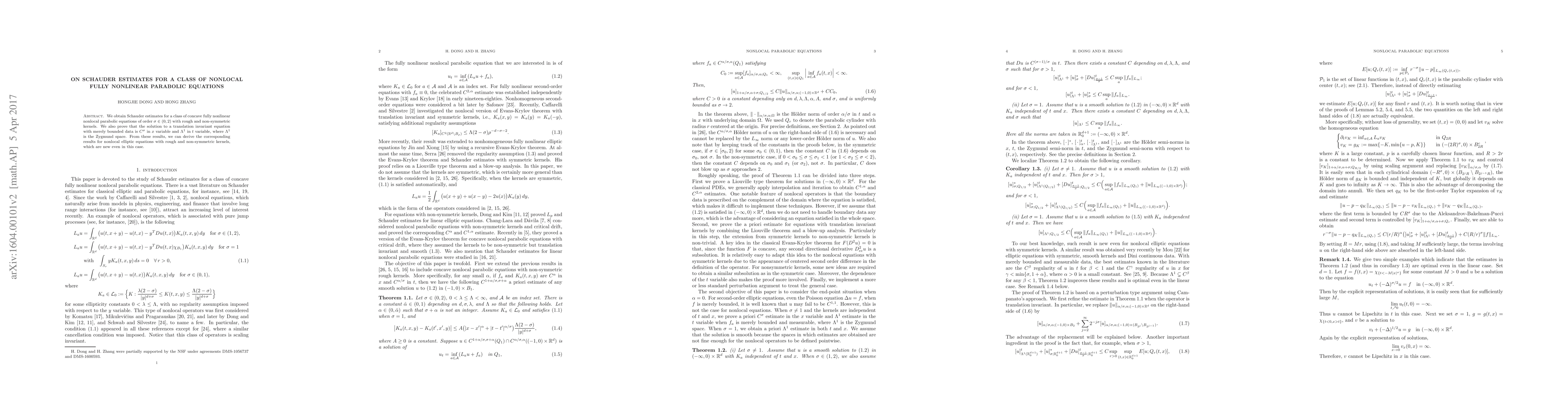 Summary: This paper establishes Schauder estimates for a class of concave fully nonlinear nonlocal parabolic equations with rough, non-symmetric kernels, demonstrating that solutions are $C^\sigma$ in the spatial variable and $\Lambda^1$ in the time variable for translation-invariant equations with bounded data.