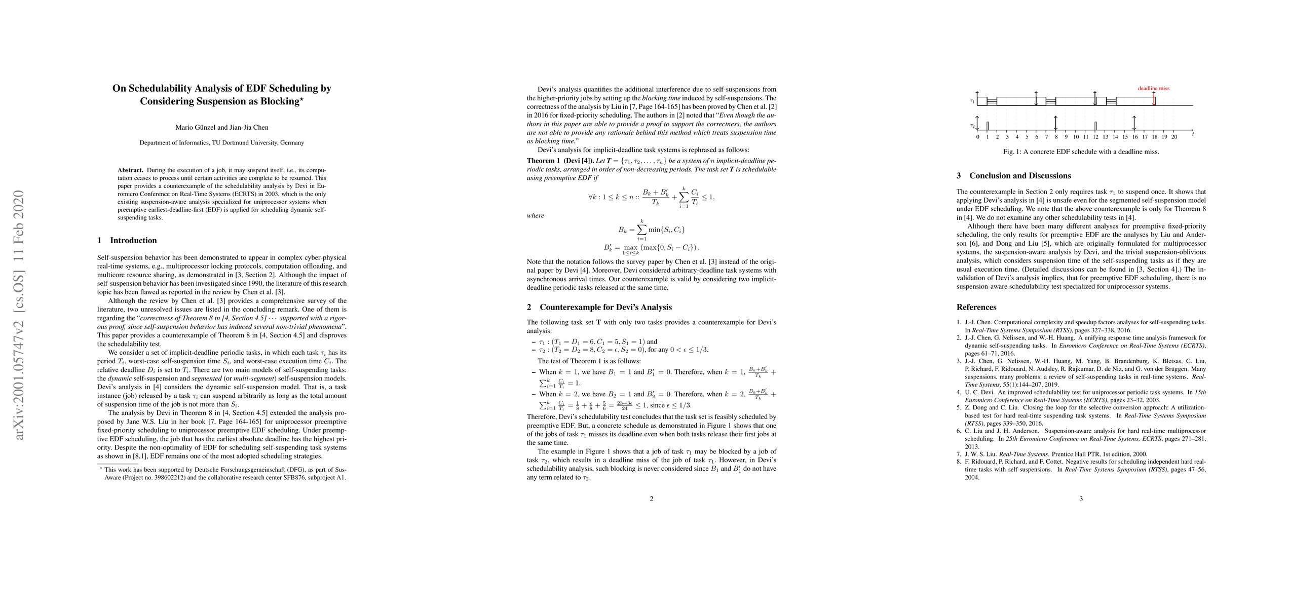 This paper presents a counterexample to the schedulability analysis by Devi for EDF scheduling with self-suspending tasks, challenging existing suspension-aware analysis for uniprocessor systems. It highlights the limitations of the prior analysis in handling dynamic task suspensions.