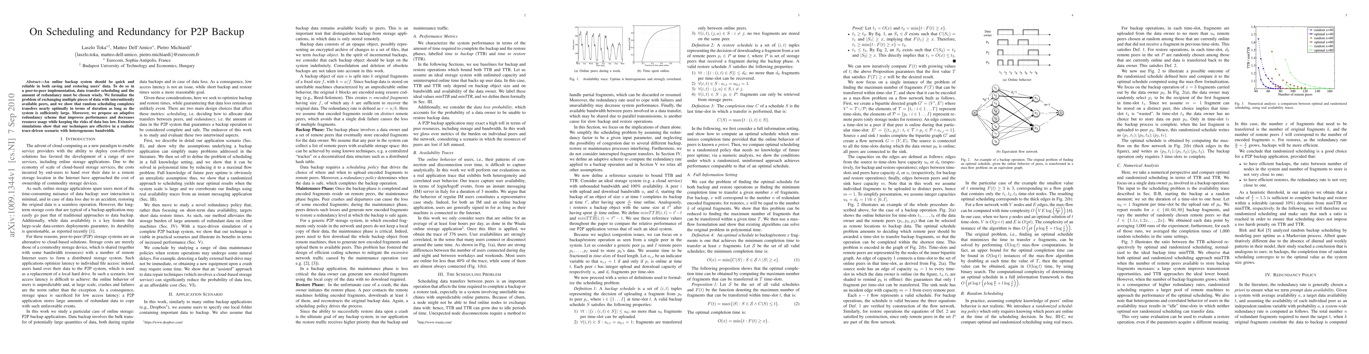 This paper explores optimal scheduling and adaptive redundancy strategies for peer-to-peer online backup systems, demonstrating that random scheduling achieves near-optimal transfer durations in large systems. It also introduces an adaptive redundancy scheme that enhances performance while minimizing resource usage and maintaining data integrity.