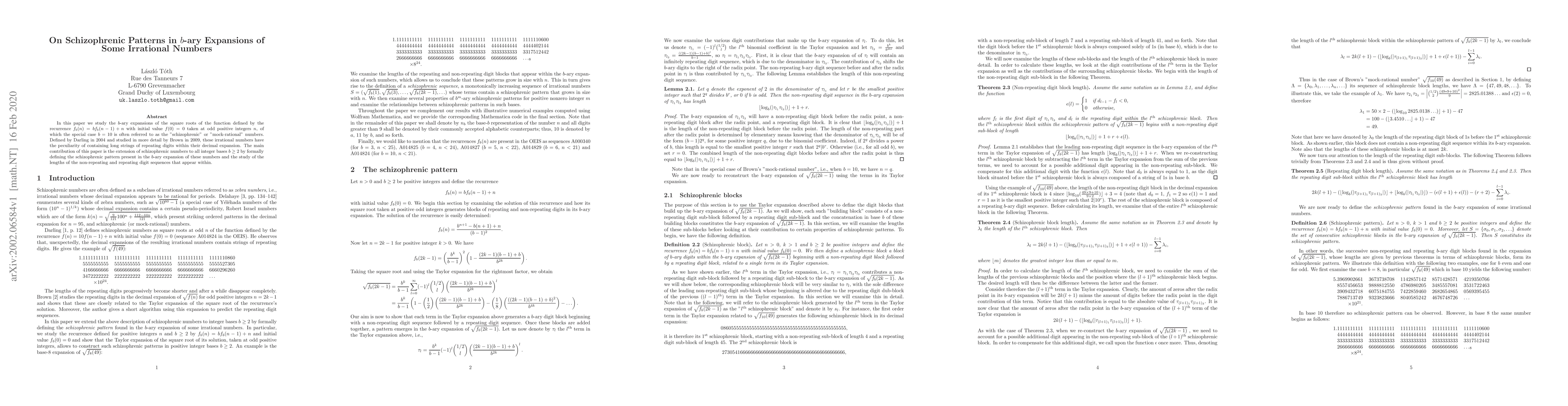 In this paper we study the $b$-ary expansions of the square roots of the function defined by the recurrence $f_b(n)=b f_b(n-1)+n$ with initial value $f(0)=0$ taken at odd positive integers $n$, of which the special case $b=10$ is often referred to as the "schizophrenic" or "mock-rational" numbers. Defined by Darling in $2004$ and studied in more detail by Brown in $2009$, these irrational numbers have the peculiarity of containing long strings of repeating digits within their decimal expansion. The main contribution of this paper is the extension of schizophrenic numbers to all integer bases $b\geq2$ by formally defining the schizophrenic pattern present in the $b$-ary expansion of these numbers and the study of the lengths of the non-repeating and repeating digit sequences that appear within.