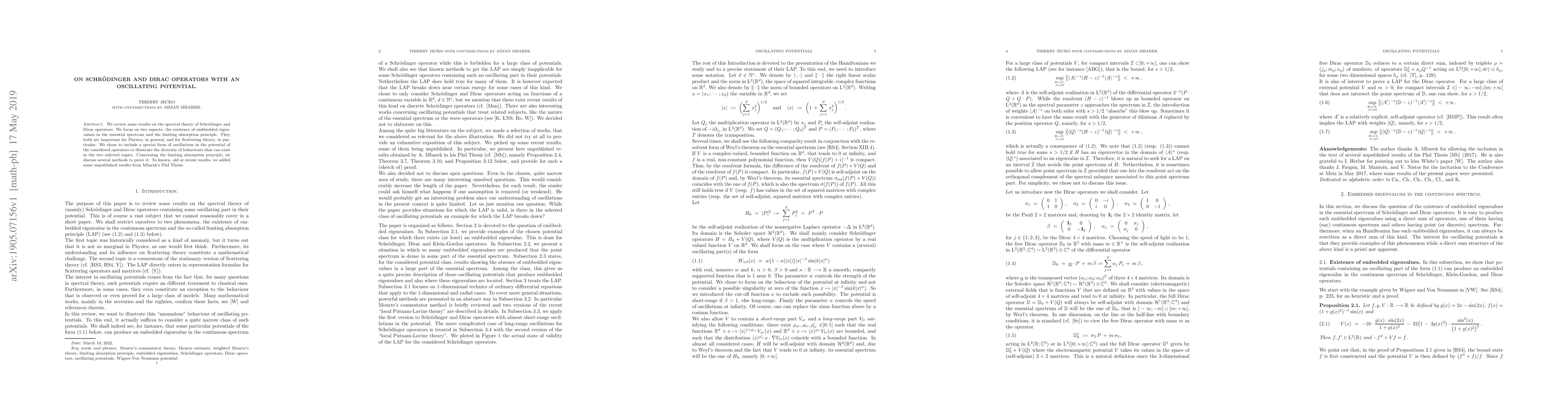 We review some results on the spectral theory of Schr{\"o}dinger and Dirac operators. We focus on two aspects: the existence of embbedded eigen-values in the essential spectrum and the limiting absorption principle. They both are important for Physics, in general, and for Scattering theory, in particular. We chose to include a special form of oscillations in the potential of the considered operators to illustrate the diversity of behaviours that can exist in the two selected topics. Concerning the limiting absorption principle, we discuss several methods to prove it. To known, old or recent results, we added some unpublished results from Mbarek's Phd Thesis.