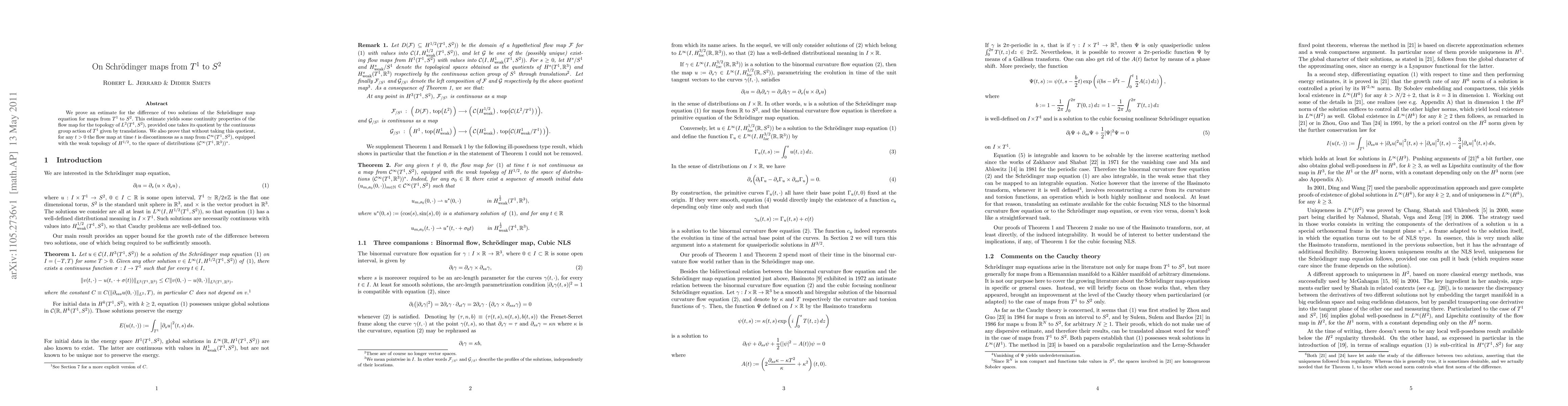 This paper proves an estimate for the difference between two solutions of the Schrödinger map equation from $T^1$ to $S^2$, establishing continuity properties of the flow map in $L^2$ topology after quotienting by $T^1$ translations. It also shows that without taking this quotient, the flow map is discontinuous for $t>0$ in the weak $H^{1/2}$ topology.