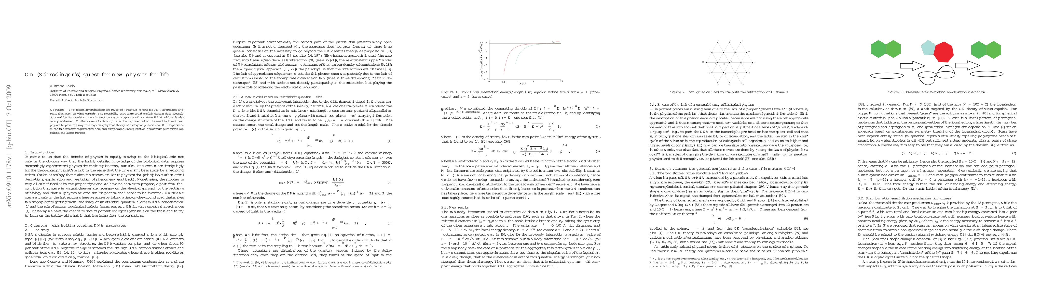 Two recent investigations are reviewed: quantum effects for DNA aggregates and scars formation on virus capsids. The possibility that scars could explain certain data recently obtained by Sundquist's group in electron cryotomography of immature HIV-1 virions is also briefly addressed. Furthermore, a bottom-up reflection is presented on the need to invent new physics to pave the way to a rigorous physical theory of biological phenomena. Our experience in the two researches presented here and our personal interpretation of Schroedinger's vision are behind the latter request.