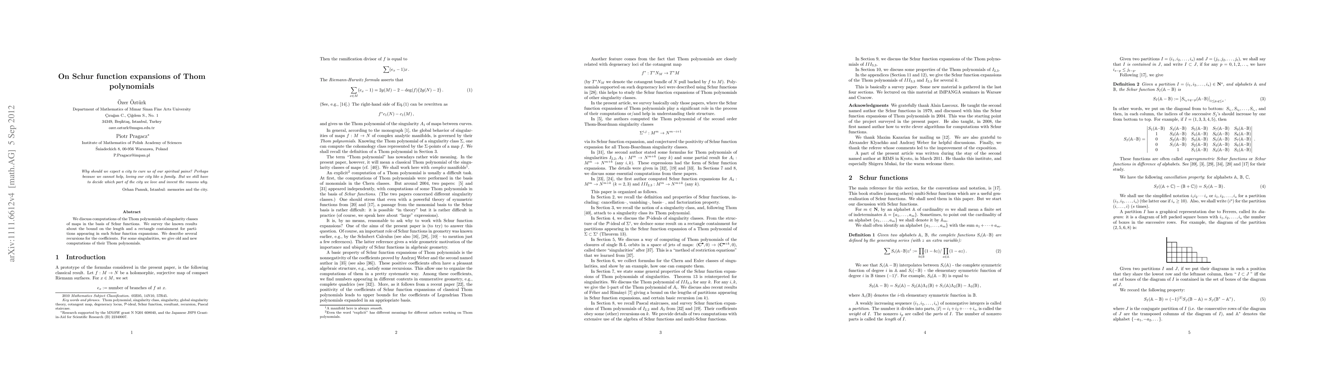 This paper explores the Schur function expansions of Thom polynomials for various singularity classes of maps, detailing known bounds and containment properties for the partitions involved. It also presents recursions for coefficients and computes both old and new Thom polynomials for specific singularities.