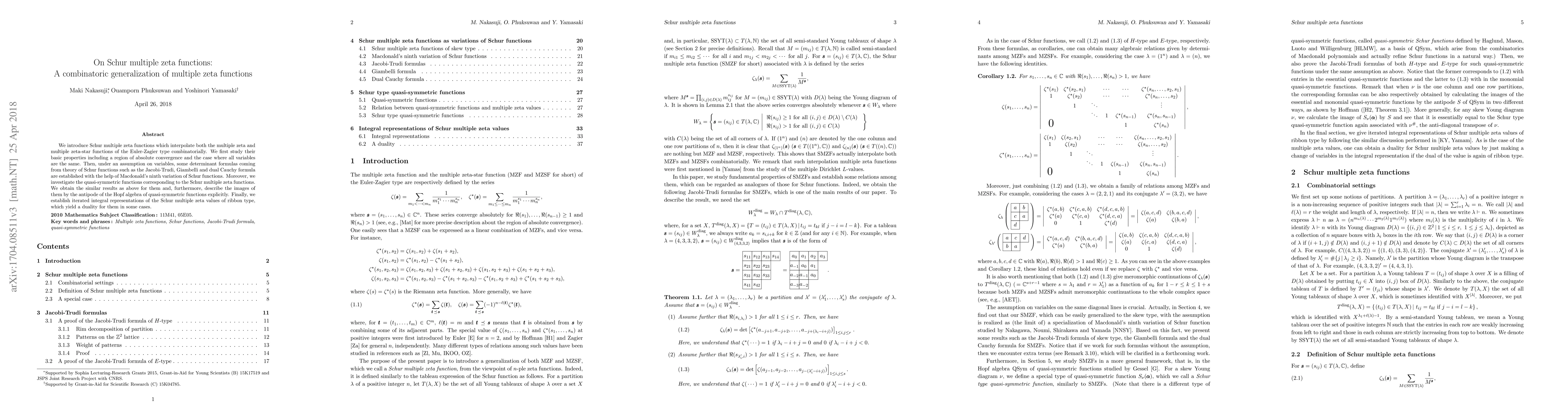This paper introduces Schur multiple zeta functions, which interpolate multiple zeta and multiple zeta-star functions. It explores their properties, establishes determinant formulas using Schur functions, and provides iterated integral representations, revealing a duality in certain cases.