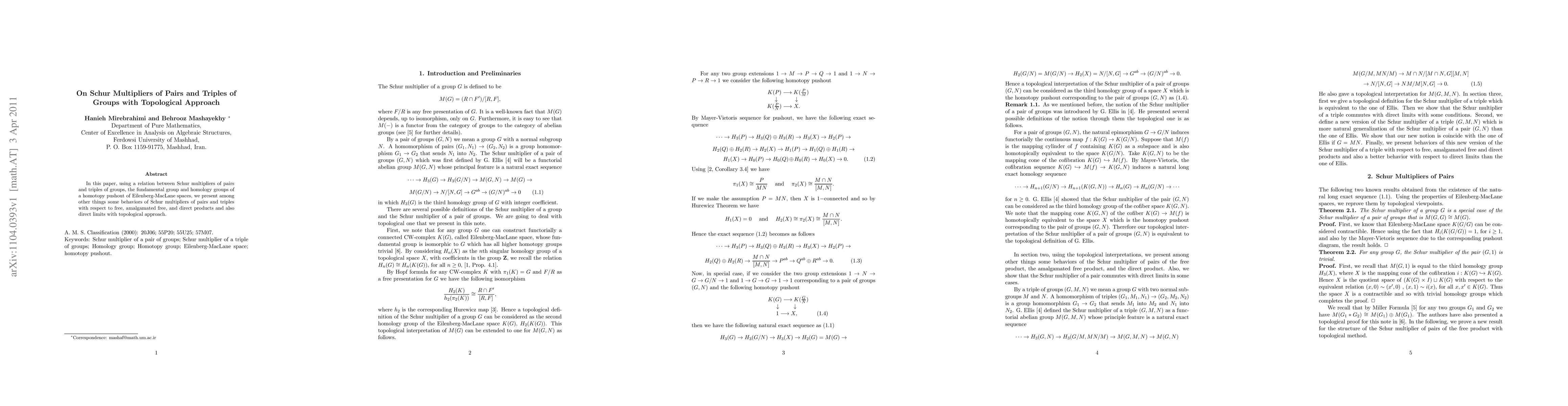 This paper explores the Schur multipliers of pairs and triples of groups through a topological approach, establishing relationships between these multipliers and the fundamental group and homology groups of homotopy pushouts of Eilenberg-MacLane spaces. It investigates the behavior of these multipliers under various group operations and direct limits.