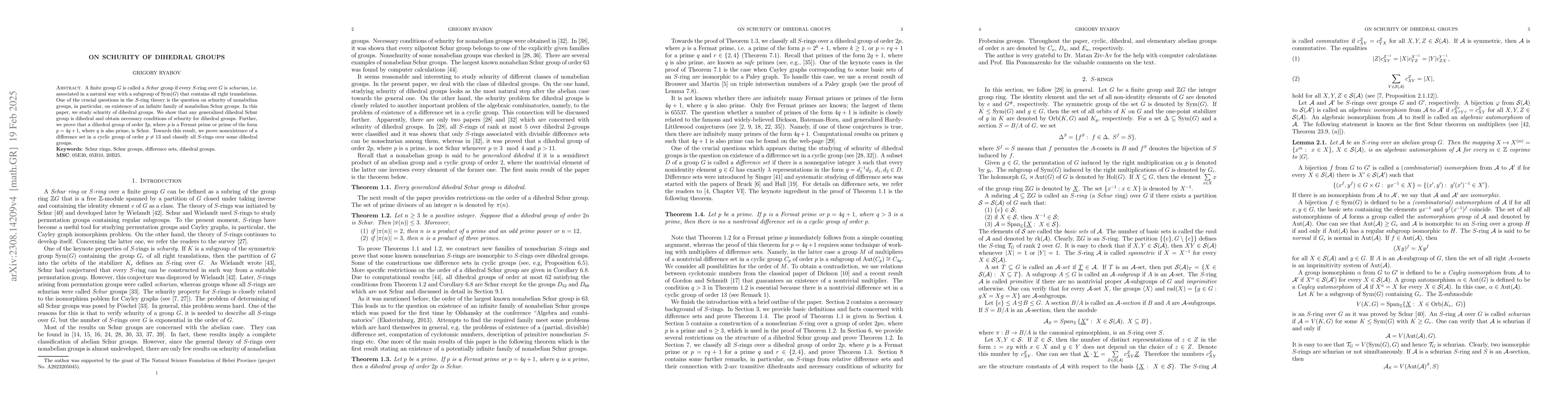 This paper proves that dihedral groups $D_{2p}$ of specific prime orders $p$ (Fermat primes or primes of the form $p=4q+1$ where $q$ is prime) are Schur groups. It also demonstrates the nonexistence of a difference set in cyclic groups of order $p\neq 13$ and classifies $S$-rings over certain dihedral groups.
