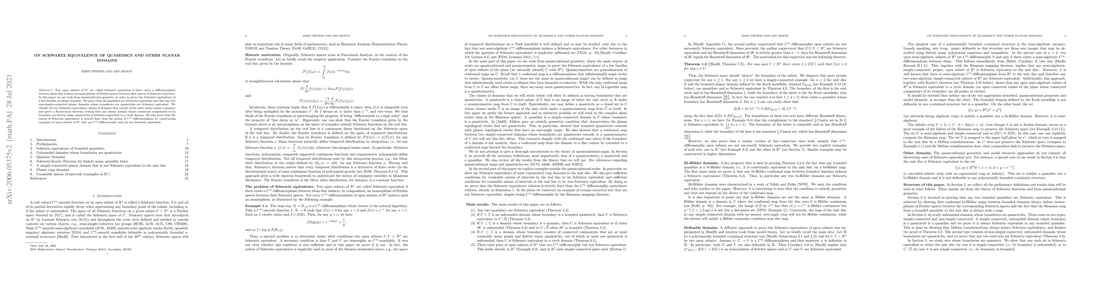 Two open subsets of $\mathbb{R}^n$ are called Schwartz equivalent if there exists a diffeomorphism between them that induces an isomorphism of Fr\'echet spaces between their spaces of Schwartz functions. In this paper we use tools from quasiconformal geometry in order to prove the Schwartz equivalence of a few families of planar domains. We prove that all quasidiscs are Schwartz equivalent and that any two non-simply-connected planar domains whose boundaries are quasicircles are Schwartz equivalent. We classify the two Schwartz equivalence classes of domains that consist of the entire plane minus a quasiarc and prove a Koebe type theorem, stating that any planar domain whose connected components of its boundary are finitely many quasicircles is Schwartz equivalent to a circle domain. We also prove that the notion of Schwartz equivalence is strictly finer than the notion of $C^\infty$-diffeomorphism by constructing examples of open subsets of $\mathbb{R}^n$ that are $C^\infty$-diffeomorphic and are not Schwartz equivalent.